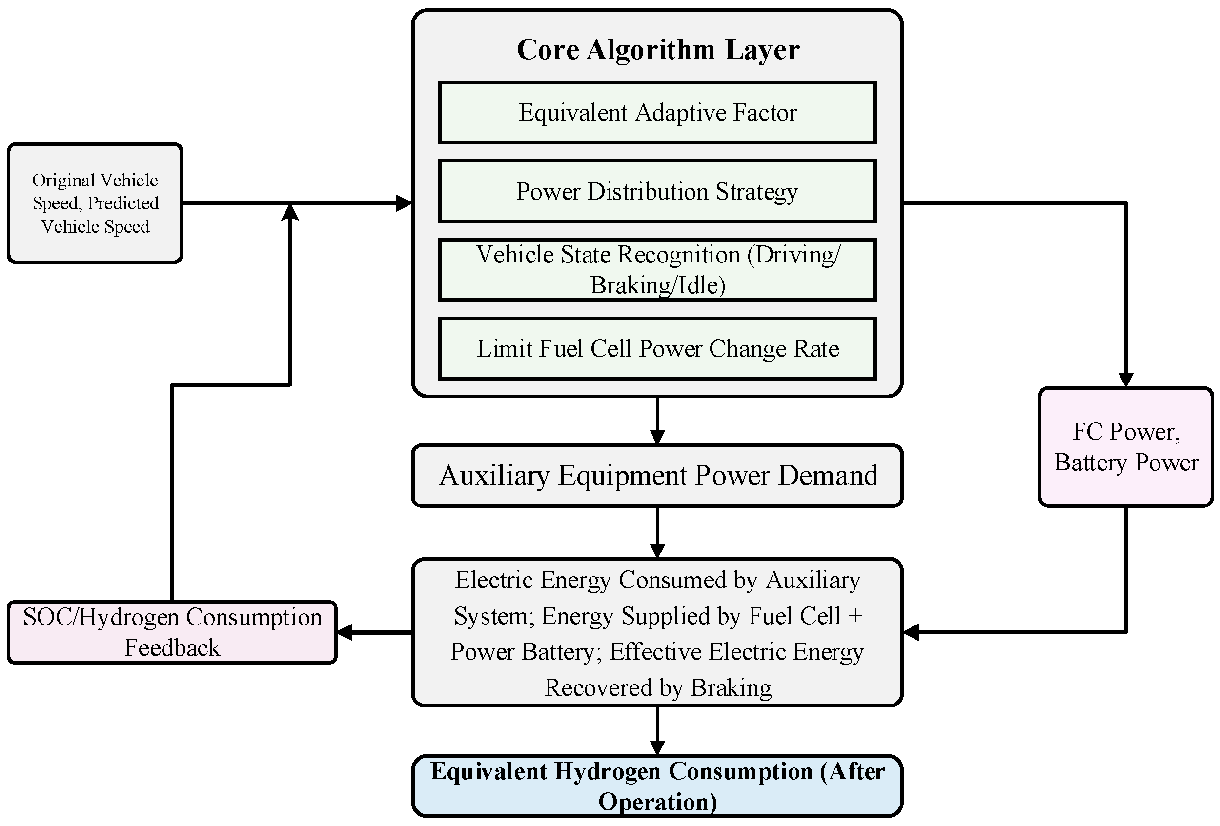 This strategy is based on real-time state perception. Firstly, it collects the current vehicle speed, power battery SOC, and driving power demand, and it inputs them into the SSA-LSTM model to generate the predicted vehicle speed for the next 3 s, providing a forward-looking operating condition basis for energy distribution. Based on the current SOC and predicted vehicle speed, the adaptive equivalent factor integrating two-dimensional characteristics is calculated through Equation (20). This factor not only reflects the regulation demand of SOC deviation on battery charging and discharging but also relates the adaptability of future vehicle speed trends to the high-efficiency interval of the fuel cell. Then, this equivalent factor is substituted into Equation (22) to solve for the fuel cell output power proportion γ(t). Combined with the total power demand of the vehicle, the real-time output power of the fuel cell is determined through Equations (24) and (25), and the power of the power battery is determined according to the energy balance relationship. At the same time, Equation (29) is strictly taken as the core optimization objective, comprehensively calculating the direct hydrogen consumption rate of the fuel cell, the equivalent hydrogen consumption compensation term for power battery charging and discharging, and the hydrogen consumption deduction term for braking recovered energy, so as to minimize the equivalent hydrogen consumption under full operating conditions. After executing the power command, the power battery SOC is updated through the current integral model in Equation (18) and fed back to the next control cycle, forming a complete logical chain of “state perception—predictive foresight—factor calculation—power distribution—hydrogen consumption optimization—SOC closed loop”. This enables all formulas to work synergistically in the strategy, ultimately achieving the economic efficiency and balance of energy management, The entire energy cycle process corresponding to this logical chain is shown in