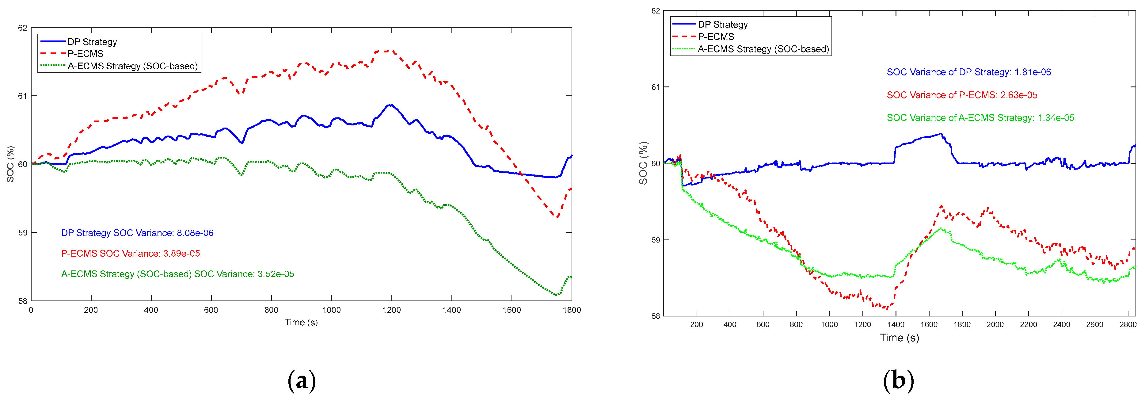 Figure 8 shows the SOC (battery state of charge) variation characteristics of the dynamic programming (DP) strategy, the Improved Adaptive Equivalent Consumption Minimization Strategy (P-ECMS), and the basic A-ECMS strategy under two driving cycles. Subfigure (a) corresponds to the C-WTVC (China World Transient Vehicle Cycle, China’s heavy-duty commercial vehicle transient cycle), and Subfigure (b) corresponds to the NREL2VAIL (National Renewable Energy Laboratory 2 Vehicle Advanced Investigation Laboratory, the U.S. National Renewable Energy Laboratory 2-type vehicle advanced research cycle), with a driving distance of 42.5 km. Under both cycles, the DP strategy achieves the best SOC stability, with variances as low as 8.08 × 10