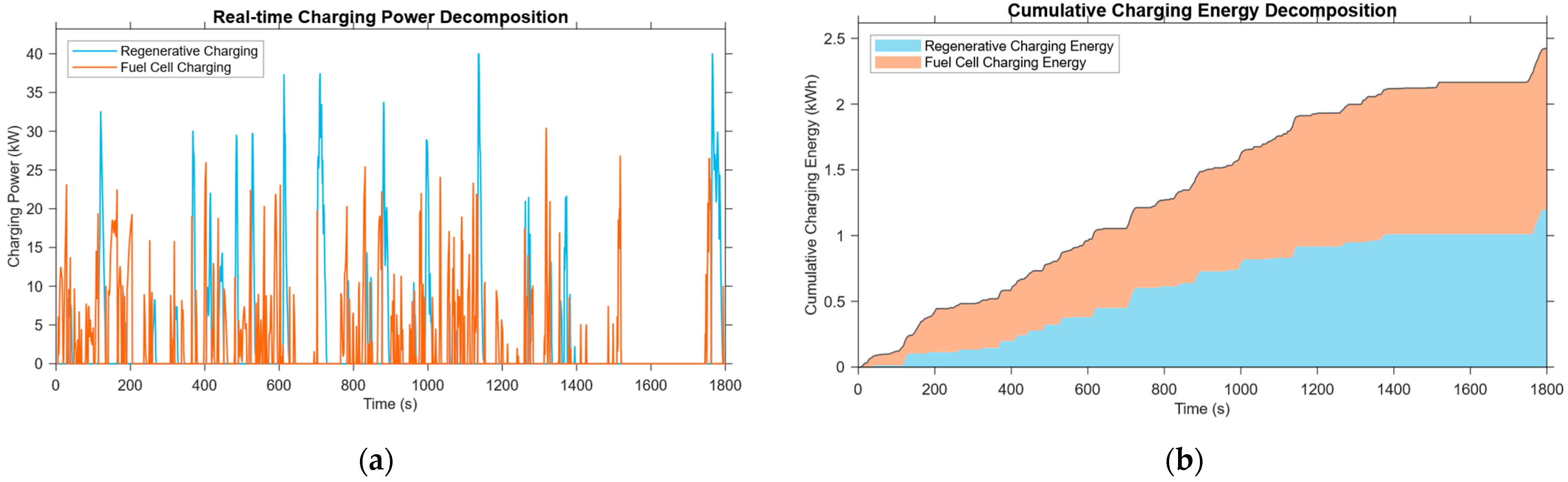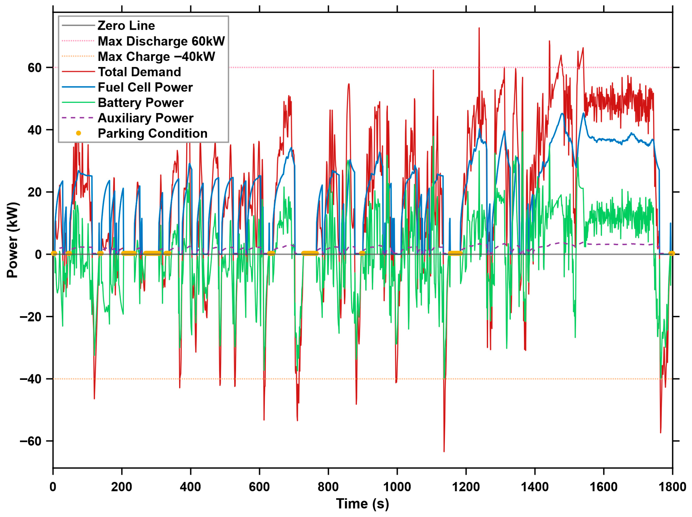 It should be noted that when the total demand is negative, the system enters a braking and deceleration process. The traction battery limiting its maximum charging power is not merely about restricting the motor’s regenerative capacity; rather, it stems from considerations of balancing braking safety and energy recovery. After all, in engineering practice, it is impossible for the motor to bear all braking torque alone—part of the required braking force must be provided by mechanical braking. Overall, through the dynamic matching of the fuel cell’s net output and the traction battery’s power, the system ensures that their sum remains balanced with the total demand power. This clearly demonstrates the energy collaboration characteristics of the multi-energy system under dynamic operating conditions, as well as the actual impact of the traction battery’s charging and discharging constraints on energy flow.