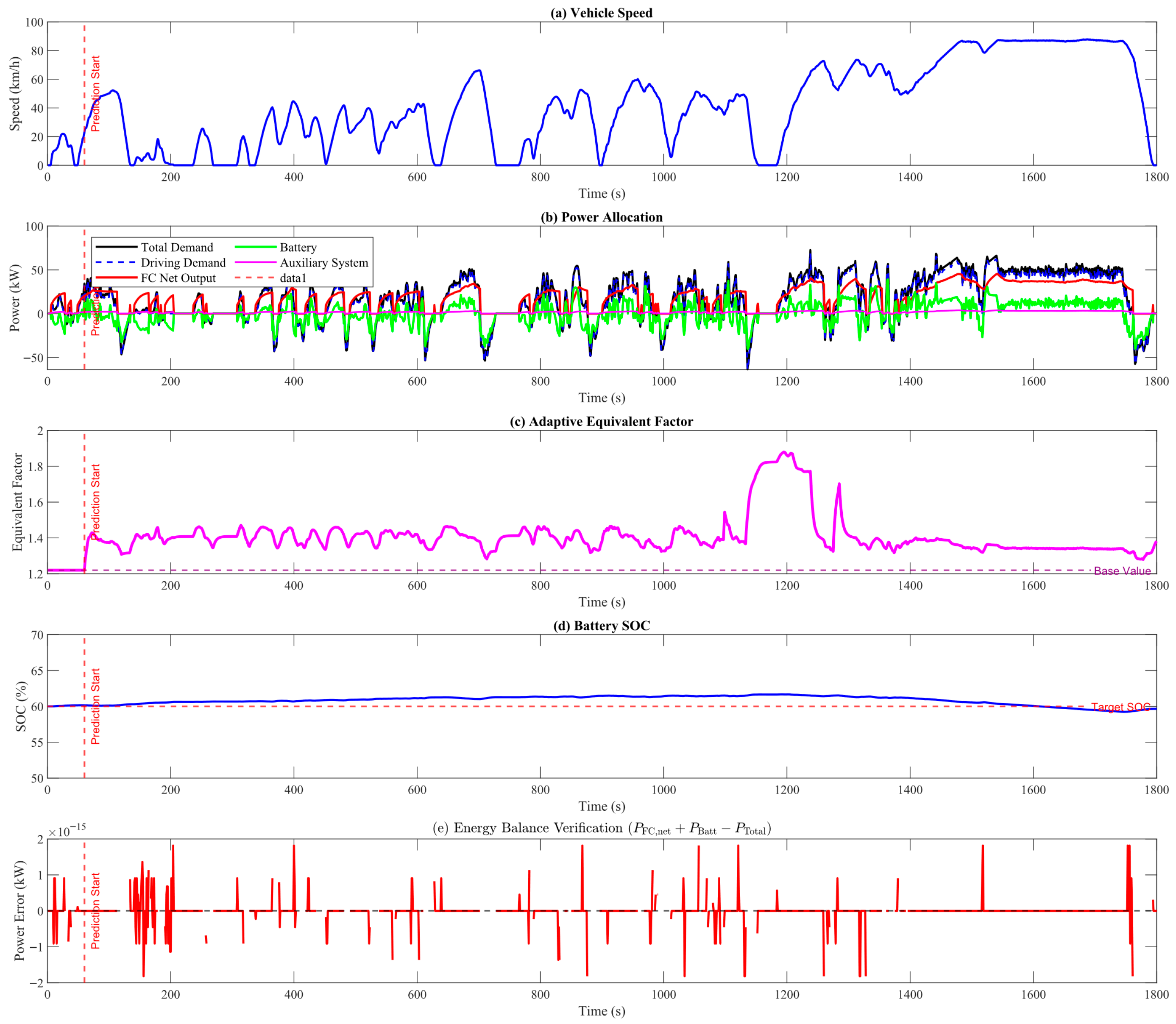 Subfigure (a) shows the vehicle speed variation, which serves as the input condition for the operating cycle; Subfigure (b) demonstrates the power distribution logic, where the total demand power includes the vehicle driving power demand and auxiliary system power demand—as the main energy source, the fuel cell primarily operates in the 15–40 kW efficient range (where its energy efficiency is relatively high), while the power battery supplements or stores energy through “peak shaving and valley filling” to cooperate with the fuel cell in meeting the total demand; Subfigure (c) presents the dynamic changes in the adaptive equivalent factor, whose control logic first divides vehicle speed into three intervals (low, medium, high) with corresponding base values for the fuel cell output proportion (highest at high speed, followed by medium speed, lowest at low speed)—the equivalent factor does not independently regulate power but performs dynamic fine-tuning on the base proportion of the corresponding interval, so it fluctuates but does not rise significantly during the high-speed stage and remains within the preset range to adapt to operating conditions; Subfigure (d) shows that the battery SOC stays stable at medium and low speeds but decreases at high speeds due to the higher power demand and the lack of regenerative braking energy recovery; finally, Subfigure (e) verifies the model’s energy conservation accuracy, with the numerical calculation error in the order of 10−15 kW, indicating that the model strictly complies with energy conservation logic at the theoretical level.