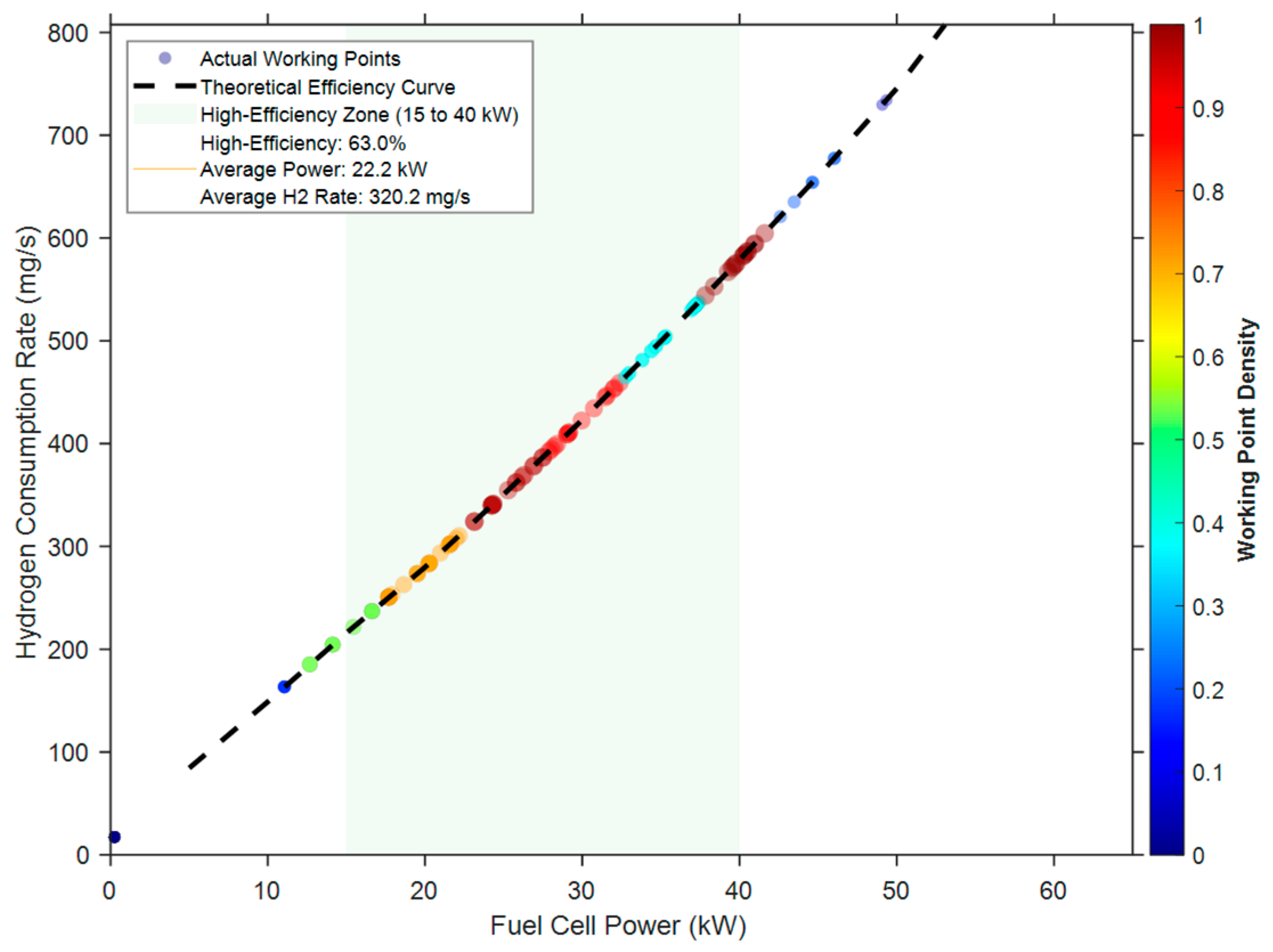 Figure 13 shows the distribution of the fuel cell’s operating characteristics. The redder the color of the scattered points, the higher the density of the operating points. Its operating points are mainly concentrated in the 15–40 kW range, which is the high-efficiency zone in the figure, accounting for 63.0%, corresponding to an average power of 22.2 kW and an average hydrogen consumption of 320.2 mg/s. The operating point density is lower in the intervals below 15 kW or above 40 kW, indicating that the adopted energy management strategy enables the fuel cell to operate more in the high-efficiency zone, thereby enhancing its energy utilization efficiency.
