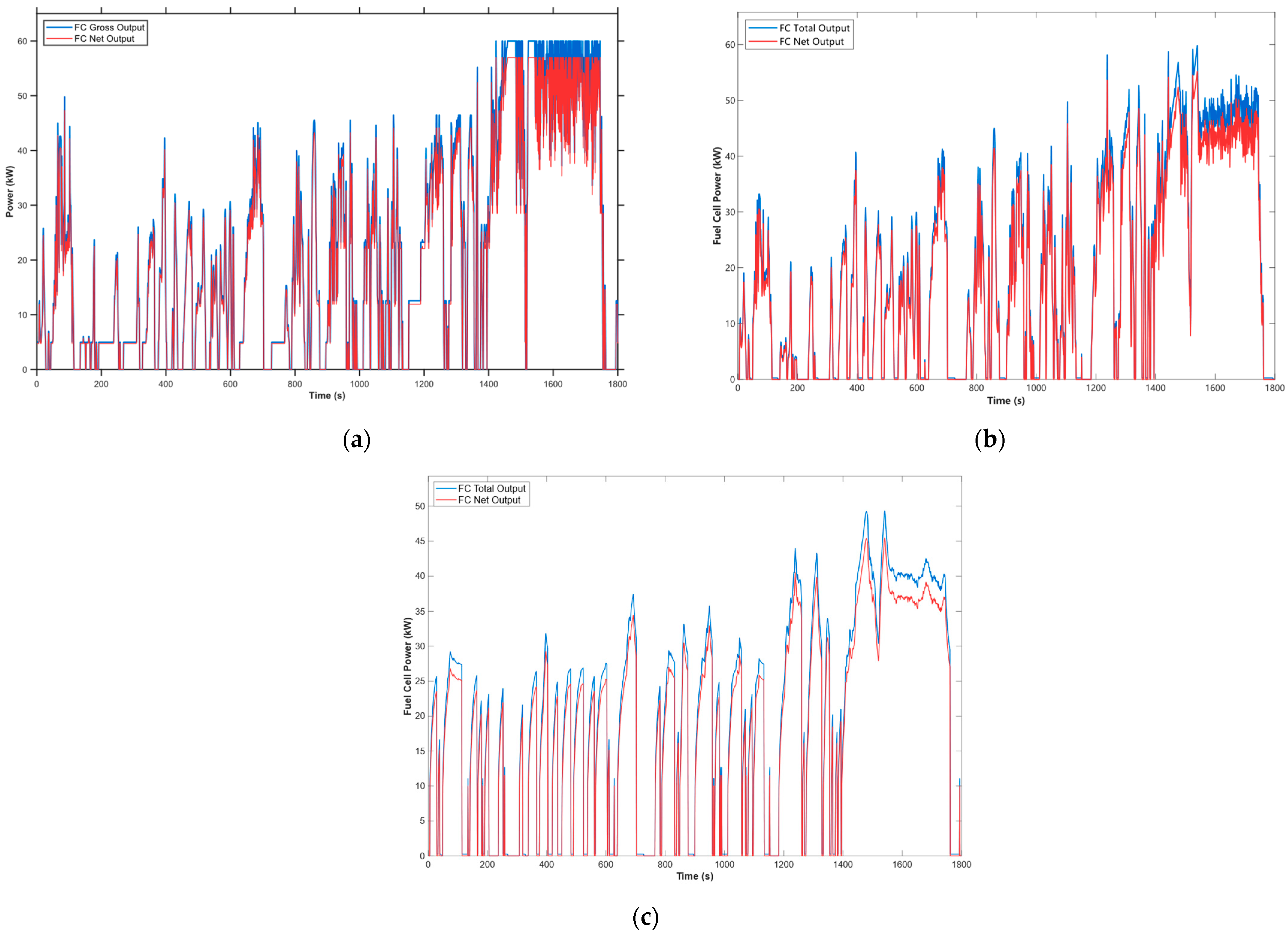 Figure 14, the DP strategy, a theoretical benchmark, results in high-frequency and large-amplitude oscillations in the fuel cell’s output power, with abrupt large-amplitude power jumps occurring instantaneously. Such aggressive power fluctuations are only feasible under ideal conditions and cannot be realized in practical applications, failing to meet the operational requirements of commercial vehicles. Thus, it can only serve as a theoretical reference for strategy optimization.