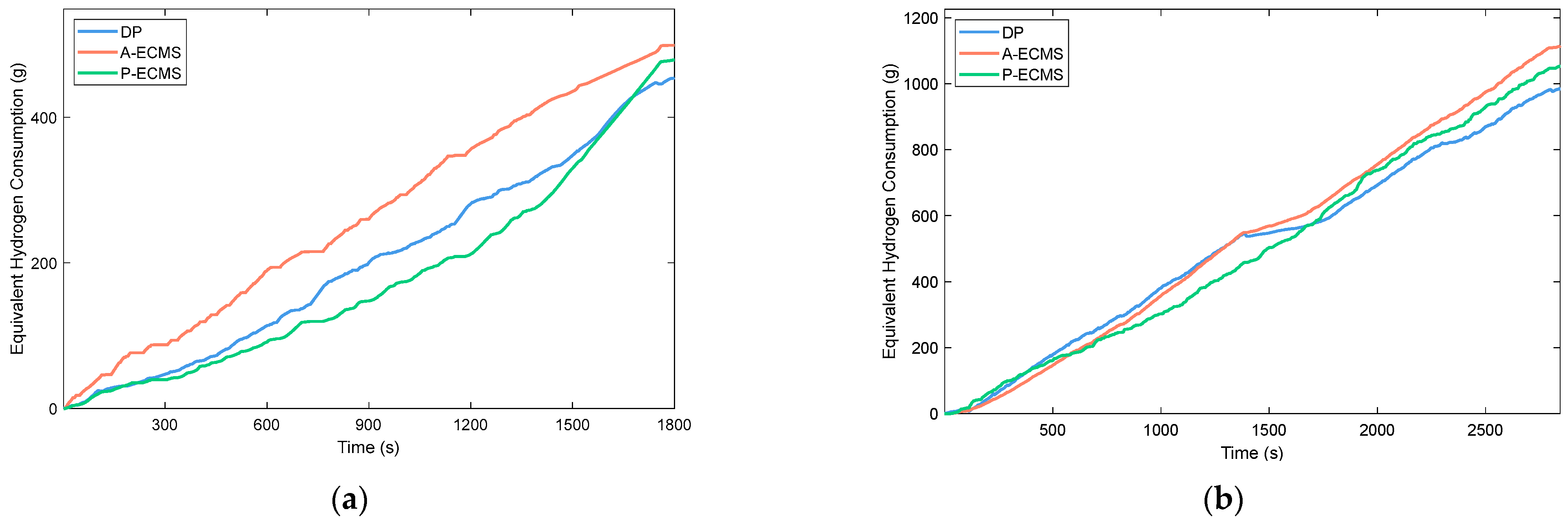 Figure 15) fluctuates smoothly, with the fluctuation frequency significantly reduced. Although its hydrogen consumption is slightly higher than that of the DP strategy, due to stable operation in the efficient zone, the equivalent hydrogen consumption is much lower than that of the traditional A-ECMS, with outstanding energy-saving effects and an overall better performance.