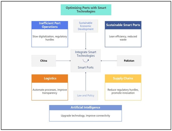 In recent years, the marine industry has undergone significant upheaval, particularly at ports, where smart technology and environmental considerations are becoming increasingly important. With technologies such as big data, artificial intelligence, and the Internet of Things, smart ports are transforming logistics operations, making them more effective and sustainable. Although environmental and technological conditions have evolved, there is a notable lack of discussion on how these conditions relate to new technologies, sustainability, and the law, particularly in developing nations. Optimize supply chain and logistics operations at smart ports. This study compares China and Pakistan to investigate the relationships among sustainability, cutting-edge technology, and the legal framework [1,2]. The two countries are among the world’s top commercial powers, with Pakistan’s port economy having substantial development potential. China’s ports rank among the busiest in the world [3]. How the port community and the broader economy can achieve sustainability goals, including carbon neutrality and resource optimization, through the intelligent integration of technology, such as lean efficiency, waste reduction, and process optimization, remains a question. Although smart port technologies have advanced significantly, China and Pakistan face particular challenges in implementing them [4]. Regulatory barriers, varied national sustainability goals, and disparate degrees of technological infrastructure complicate the deployment of smart technology in ports.