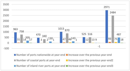 China has dramatically expanded its port production capacity in recent years, a testament to its quality as an orderly and competitive nation. The growth of both inland and coastal ports is a key element in China’s push to increase the efficiency of its trade while making itself an indispensable engine of the global commerce structure (as shown in Figure 3). Especially for larger ships in China, the capacity to handle a wide range of cargo, from containerized goods and bulk to LNG, has increased. This expanding infrastructure not only facilitates the increasing levels of trade but also highlights China’s potential to handle large volumes of personal effects rapidly and cost-effectively [56].