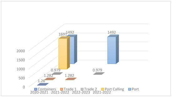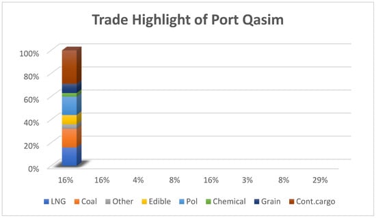 The primary type of cargo being processed at Port Qasim, Pakistan, all year round (as shown in Figure 5). Containers made up the most significant portion, confirming the port’s critical place in global trade. Coal and LNG claimed second standings, evidence of the port’s role in handling energy imports. Such distribution is a reflection of the broad spectrum of cargo sectors integral to the total throughput volume at Port Qasim as well as its strategic role in Pakistan’s trade [64].