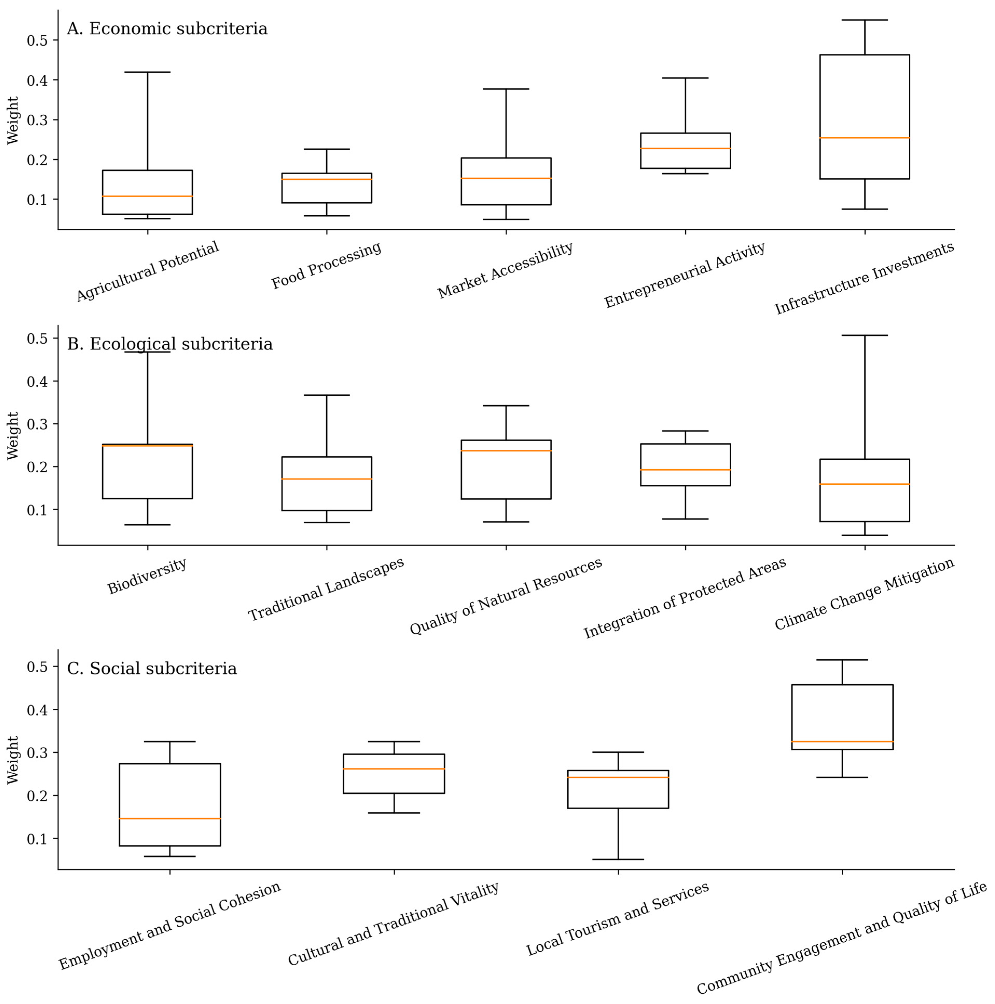 Table A1). Other indicators: market availability (16.0%), food processing (14.5%) and agricultural potential (13.3%) were less significant. Similar trends could be observed in relation to ecological and social subcriteria, with individual elements dominating and determining the main pathway in which measures could make the largest contribution. Regarding ecological value added, the highest significance was given to biodiversity (22.8%), integration of protected areas (21.2%) and quality of natural resources (21.2%). If combined, they accounted for more than two-thirds of the overall ecological priority, thereby stressing the need to preserve and integrate natural areas and maintain their quality. A slightly smaller but still significant proportion was held by traditional landscapes (18.7%) and climate change mitigation (16.1%), demonstrating the significant role of maintaining landscape identity and climate policy elements in maintaining a sustainable environment.