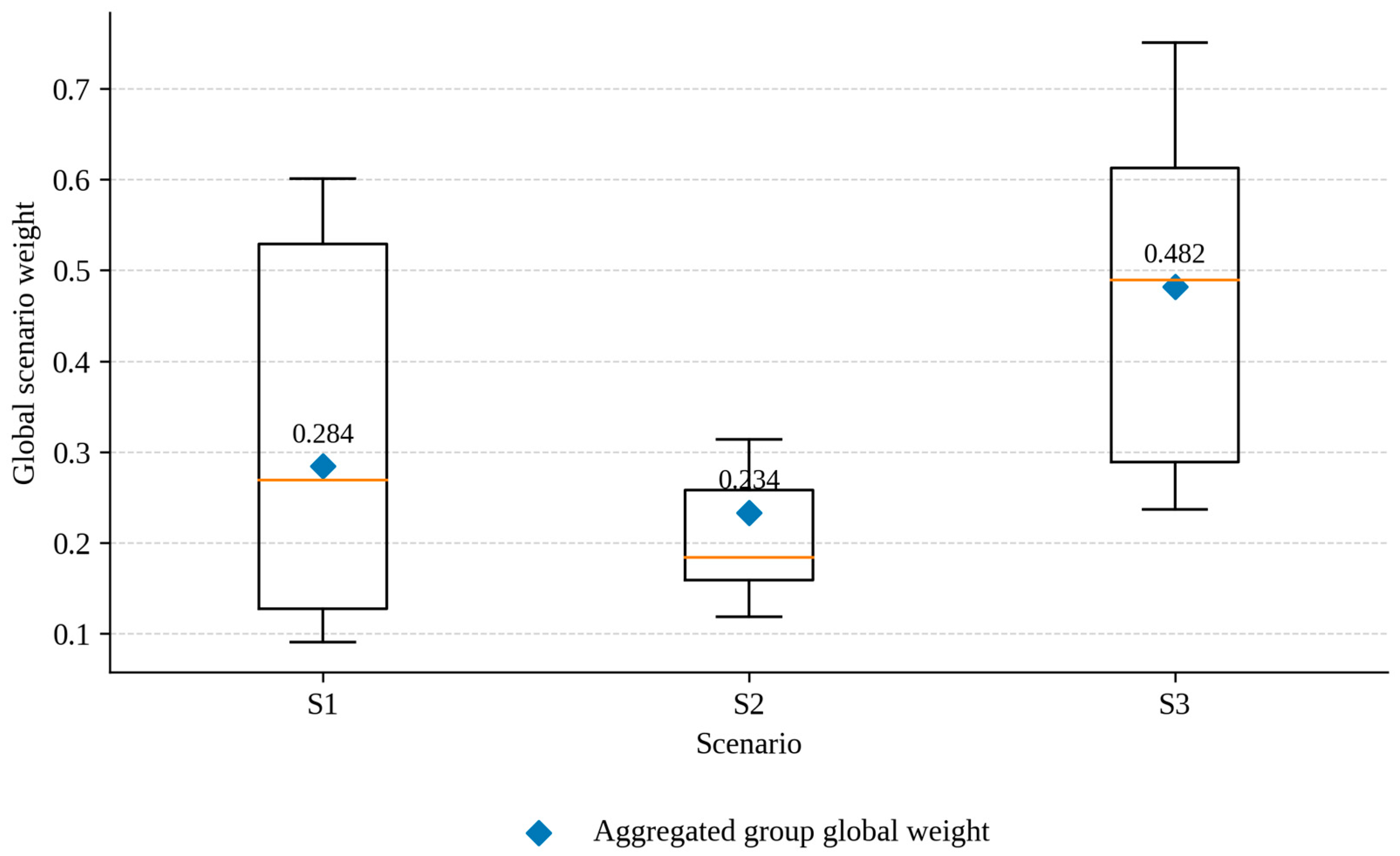 Table A4. At the level of the main criteria, the CR was found at 0.00069, which was well below the internationally accepted permissible threshold of 0.1. There were nuanced differences in the weight distributions of global priority vectors by individual experts, yet they were based on consistent and coherent ratings, as evidenced by the very low CR. Although the experts assigned different meanings to some criteria or scenarios, the approach to comparing them remained uniform and coherent. This ensured that the combined expert result was not contradictory and reflected a common view of priorities.