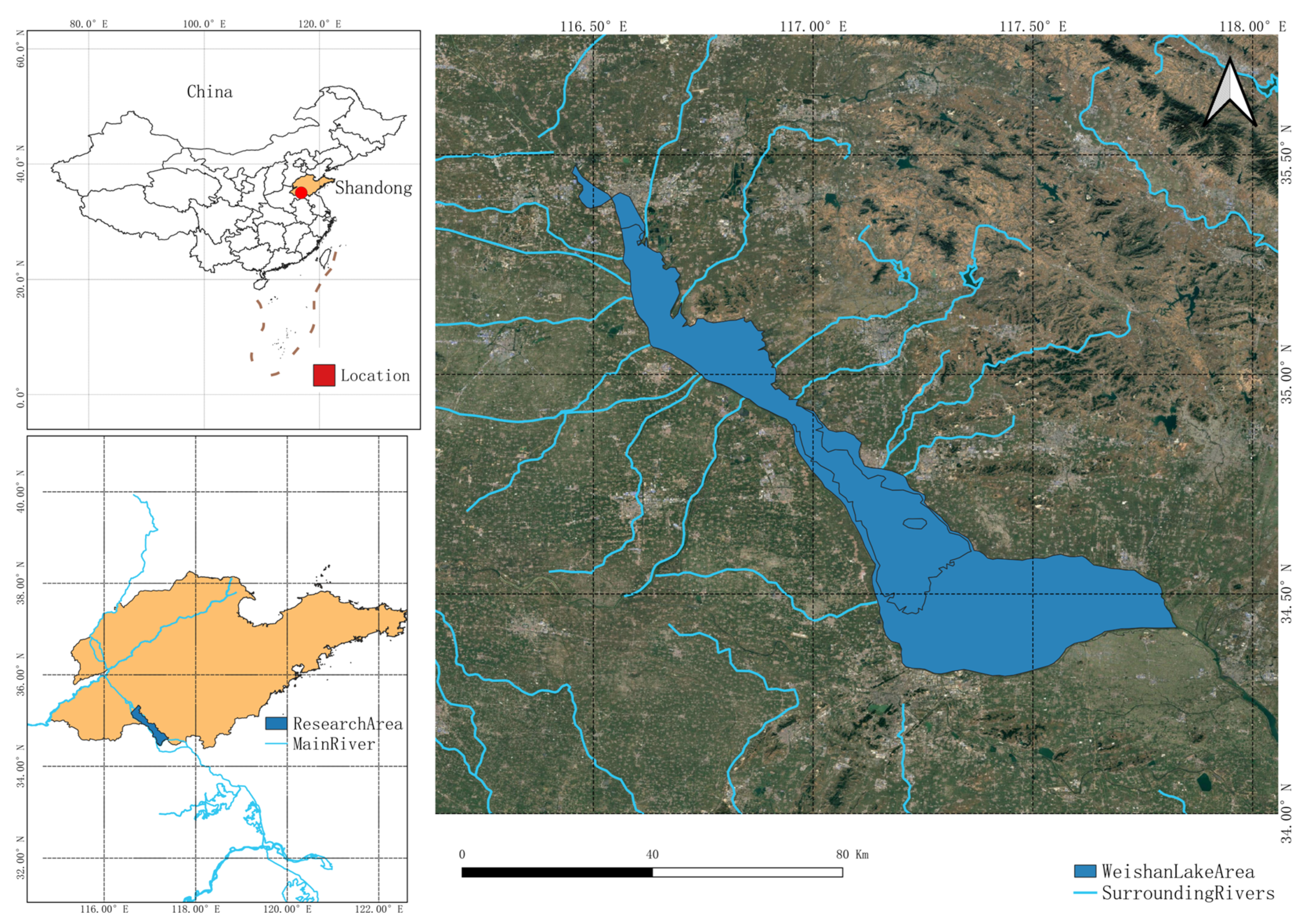 Weishan Lake, one of the largest freshwater lakes in northern China and a key component of the eastern route of the South-to-North Water Diversion Project, provides a model case for water resource monitoring research oriented towards sustainable development. Besides its ecological value, Weishan Lake is also an important irrigation water source, supporting widespread agricultural production in the surrounding area. The region has a complex hydrological pattern, encompassing open water areas, riparian wetlands, irrigation canals, and paddy fields, all of which are highly sensitive to seasonal water level changes. The lake’s irregular shoreline and the dynamic interactions between open water areas, wetlands, and cultivated land introduce significant uncertainties to the delineation of water body boundaries using traditional remote sensing techniques. Therefore, Weishan Lake provides an ideal location for advancing fine-scale classification of irrigation-related water bodies and transitional zones in near-water agriculture. For an overview and geographical location of the study area, please refer to