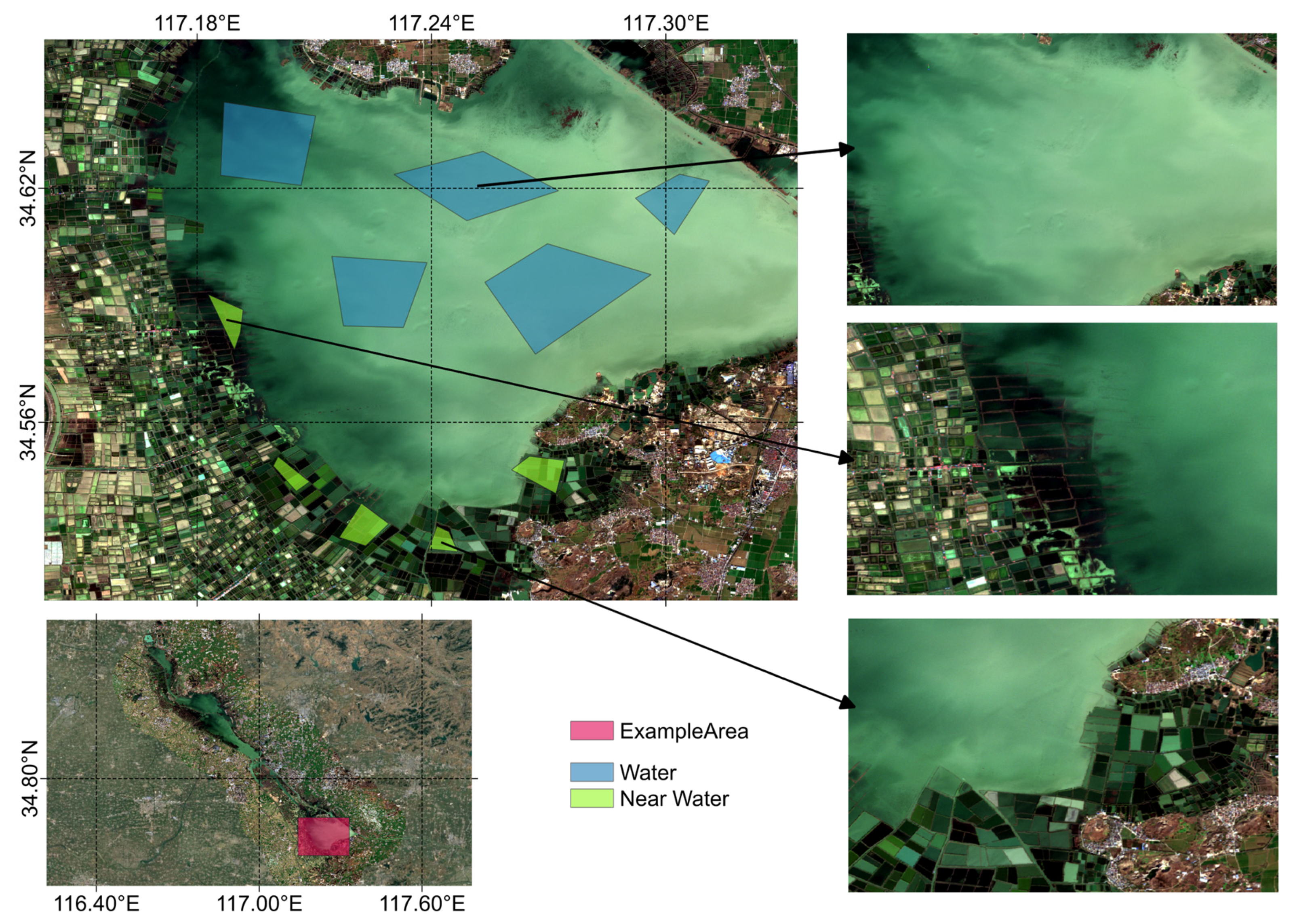 All classifications were trained using manually selected samples and executed through tile-based sampling and prediction to control computational cost and memory consumption. The training data were derived from representative land cover regions, including three major classes: water bodies, near-water land, and non-water areas. Examples of water bodies and near-water land use in the three types of areas are shown in