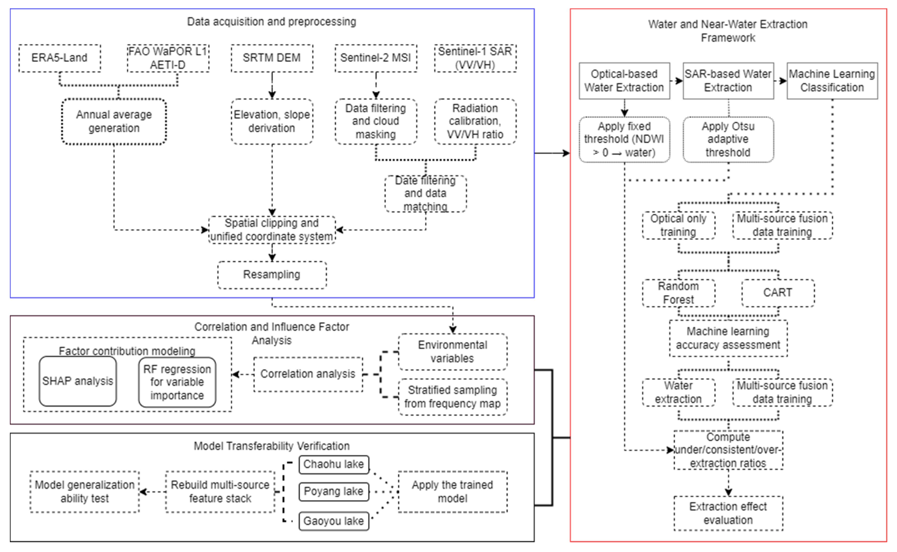 The integration of these diverse datasets ensures a robust and transferable foundation for multi-temporal water classification and environmental interpretation. By combining dynamic surface observations with atmospheric and land surface drivers, this study establishes a comprehensive multi-source data framework suitable for both classification and subsequent impact factor analysis.