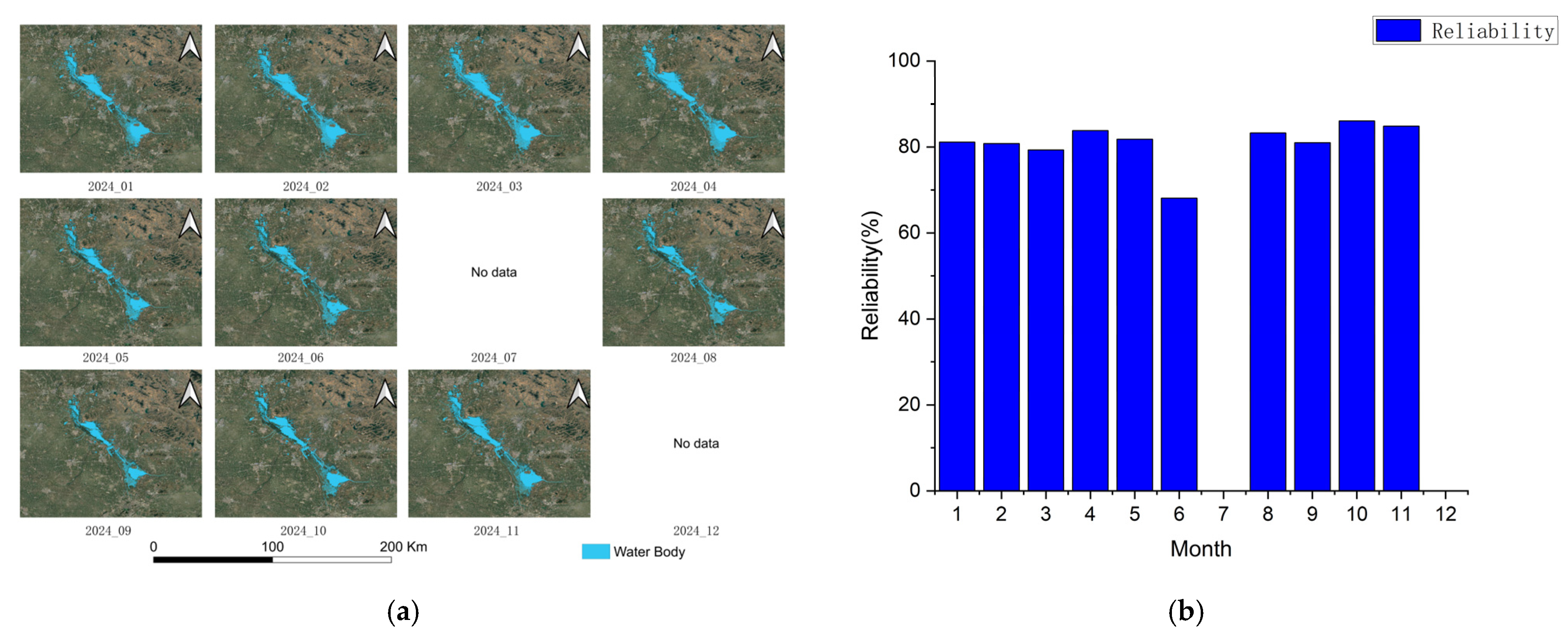 The results show that the Sentinel-2 index-based water body extraction method remains stable for most months of the year, with reliability mainly between 80% and 85%. Reliability is higher in spring and autumn, peaking at 86.05% in October, while reliability declines significantly in early summer, reaching its lowest point in June (68.14%). However, it exhibited misclassification in small water bodies and near-water agricultural areas, highlighting its limitations under complex surface conditions (