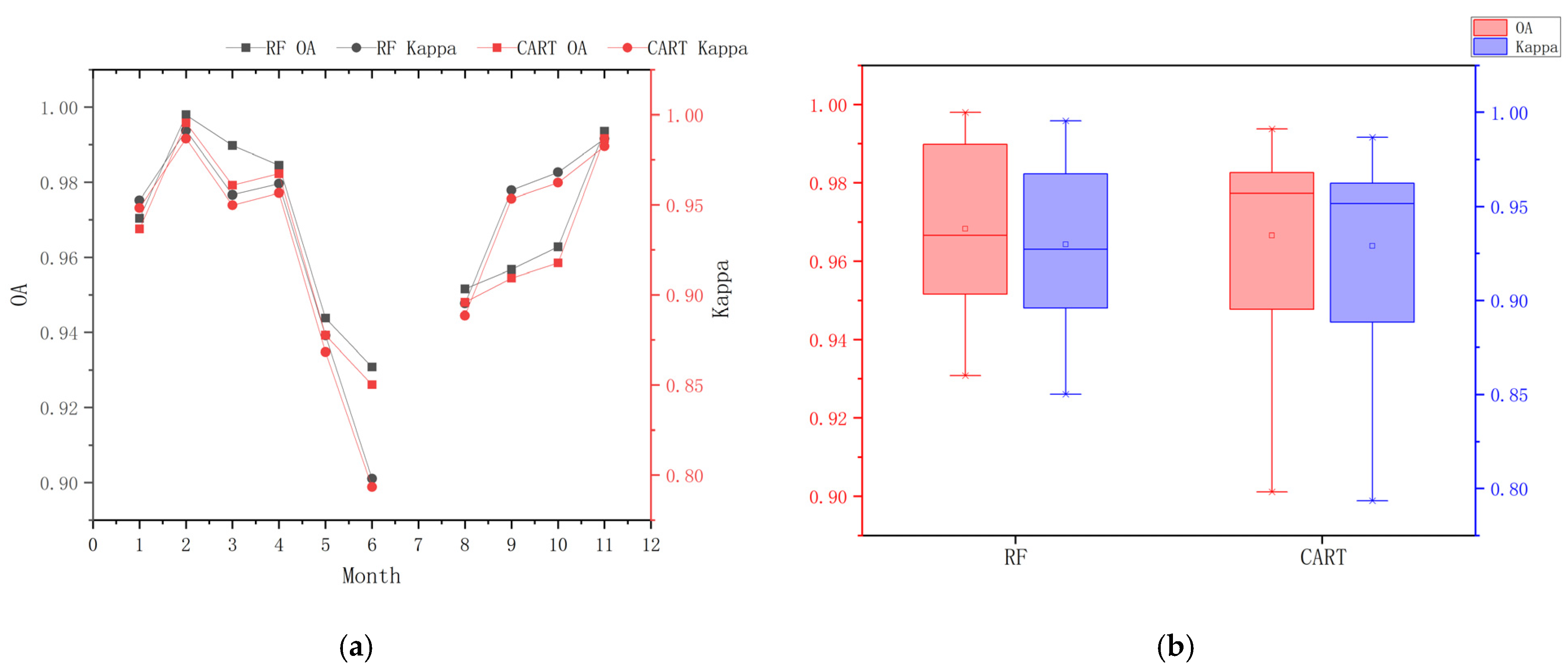 Specifically, the annual mean OA and Kappa coefficient of the RF classifier reached 96.5% and 0.93, respectively, whereas those of CART were 95.8% and 0.91. These results, consistent with Sun et al. [