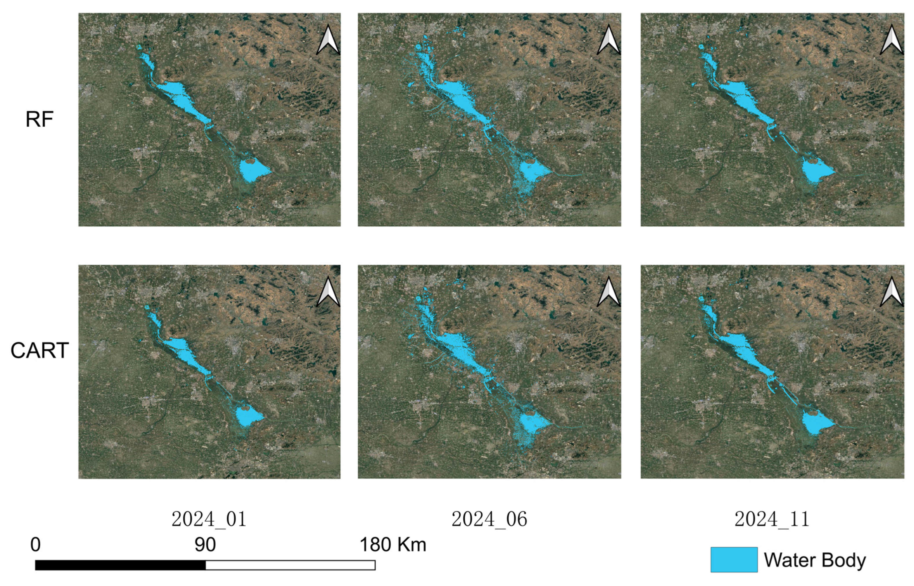 To further improve the accuracy and robustness of water body extraction, two representative machine learning algorithms—Random Forest (RF) and Classification and Regression Tree (CART)—were implemented on the Google Earth Engine (GEE) platform. These approaches have demonstrated high reliability for water and land cover classification under complex surface conditions with multi-source remote sensing data. Previous studies have confirmed that integrating machine learning with object-based image analysis or multi-source data fusion can significantly enhance the detection of small-scale water bodies and near-shore zones [