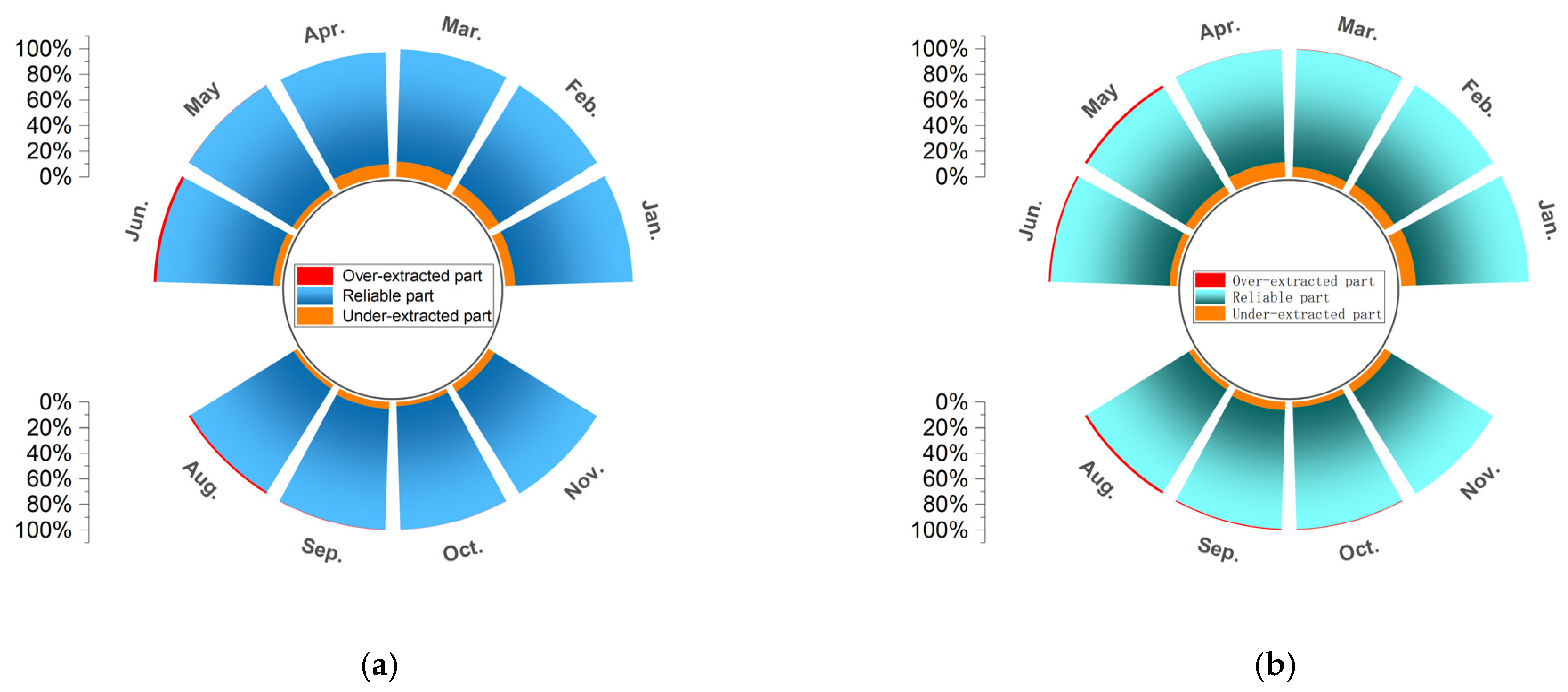 To verify the reliability of both extraction methods, the results of the NDWI-based index method and the SAR-based adaptive threshold method were compared with monthly visual interpretation maps. The spatial agreement ratio—defined as the proportion of overlapping areas between the extracted and visually interpreted results—was used to evaluate extraction accuracy and temporal consistency (