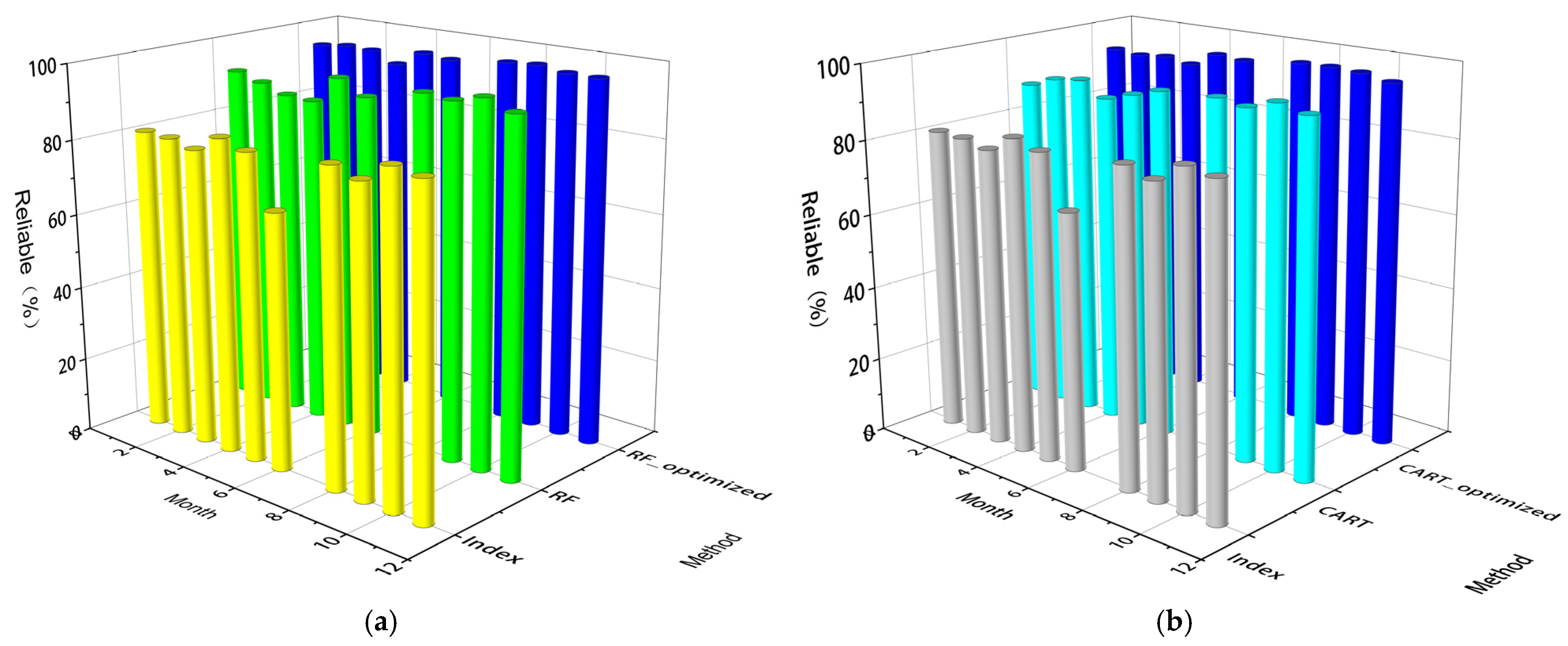 3.3. Monthly Reliability and Accuracy Analysis of Different Machine Learning Methods