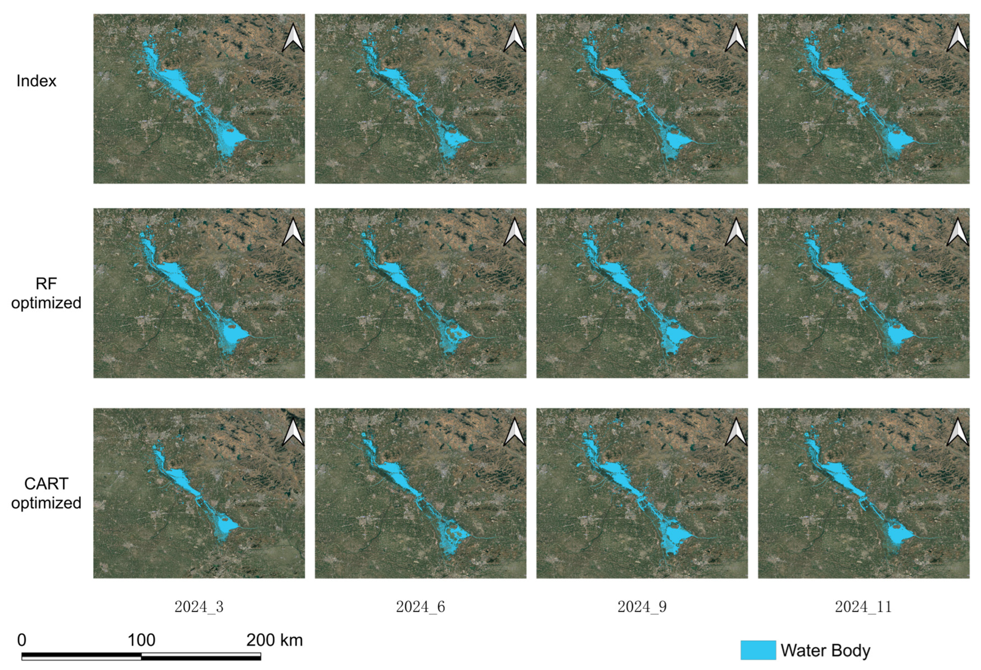 Table 3 summarizes the monthly classification accuracy of the RF and CART models based on optical remote sensing data in 2024, together with their corresponding 95% confidence intervals derived from bootstrap resampling. Overall, both methods achieved high classification accuracy across most months, with OA values generally exceeding 0.93 and Kappa coefficients indicating strong agreement beyond chance. The bootstrap results reveal negligible variability in OA and Kappa estimates, suggesting that the classification performance of both RF and CART models is highly stable with respect to sampling uncertainty. Seasonal differences are nevertheless observable, with relatively lower accuracy during late spring and early summer, coinciding with increased vegetation coverage and enhanced spectral confusion between water and non-water surfaces.