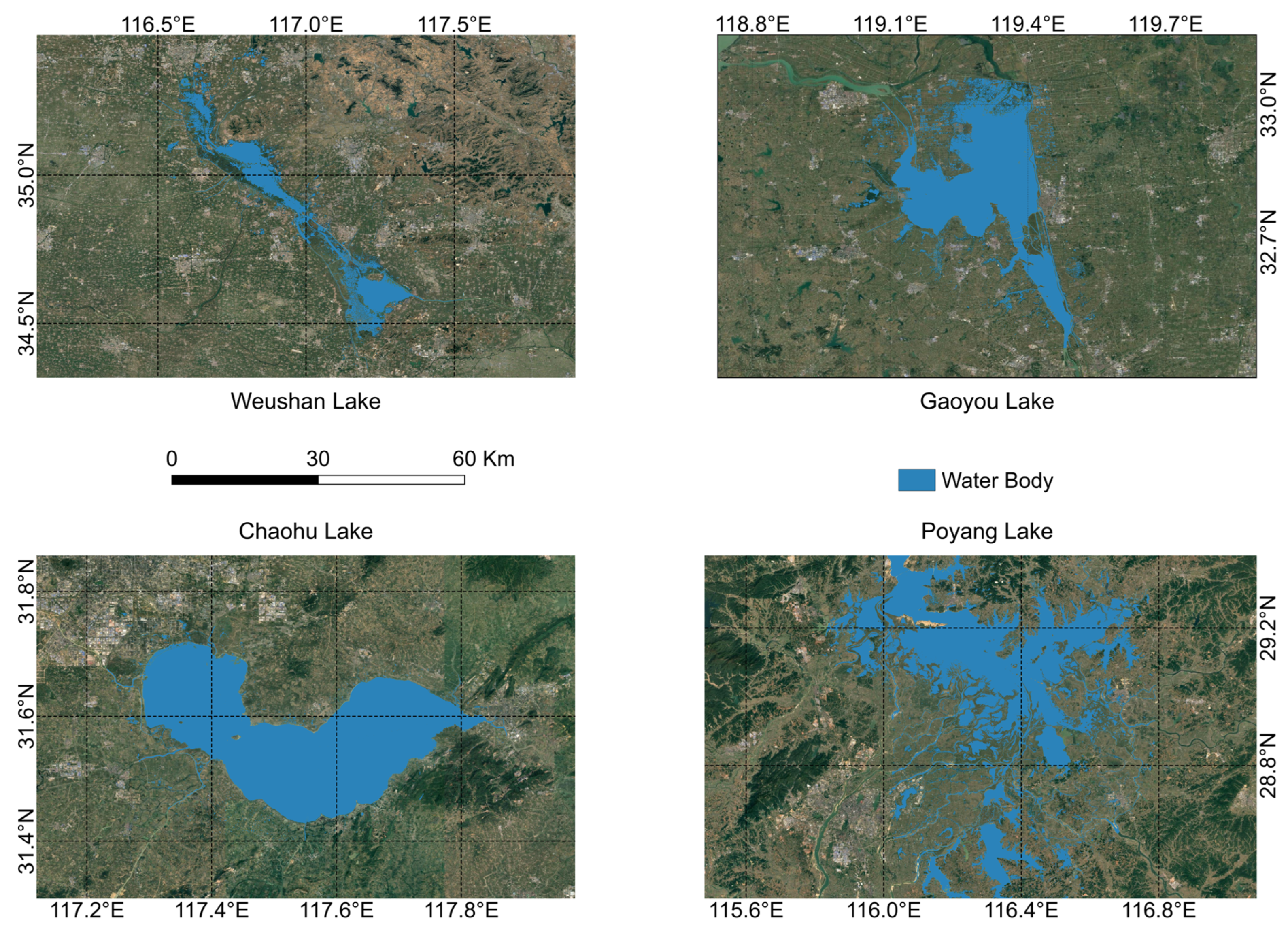 2]. The advancement of medium- and high-resolution optical imagery and synthetic aperture radar (SAR) data has particularly facilitated dynamic monitoring of water bodies across various spatial scales—from local to regional [