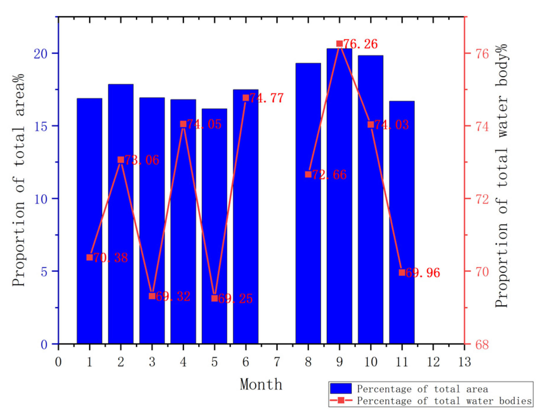 Figure 14, the proportion of near-water land pixels relative to the total area fluctuated across months, with an annual average of 17.8%. The maximum value occurred in September (20.3%), and the minimum in May (16.2%).
