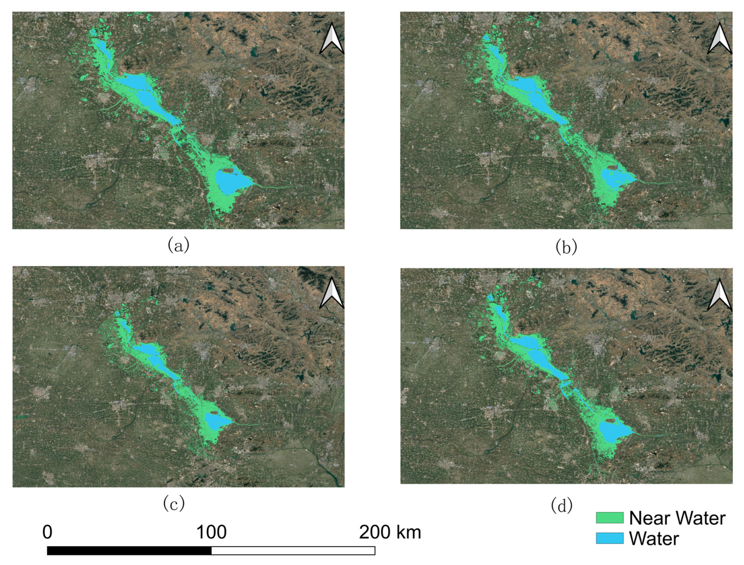 Figure 2. After manual delineation of vector polygons, a stratified random sampling procedure was applied within each polygon to generate training samples, with approximately 1600 points per dataset (about 1000 water and 600 non-water samples). The sample selection followed two key principles: (1) spectral representativeness, ensuring coverage of various water and non-water spectral signatures, and (2) spatial balance, prioritizing clear, cloud-free regions with well-defined boundaries to minimize spectral mixing and misclassification errors. In addition, separate training sets were constructed for different seasons to adapt to changes in vegetation cover and water level, while maintaining consistency in sample size and class ratios across seasons to ensure comparability and robustness of classification performance.