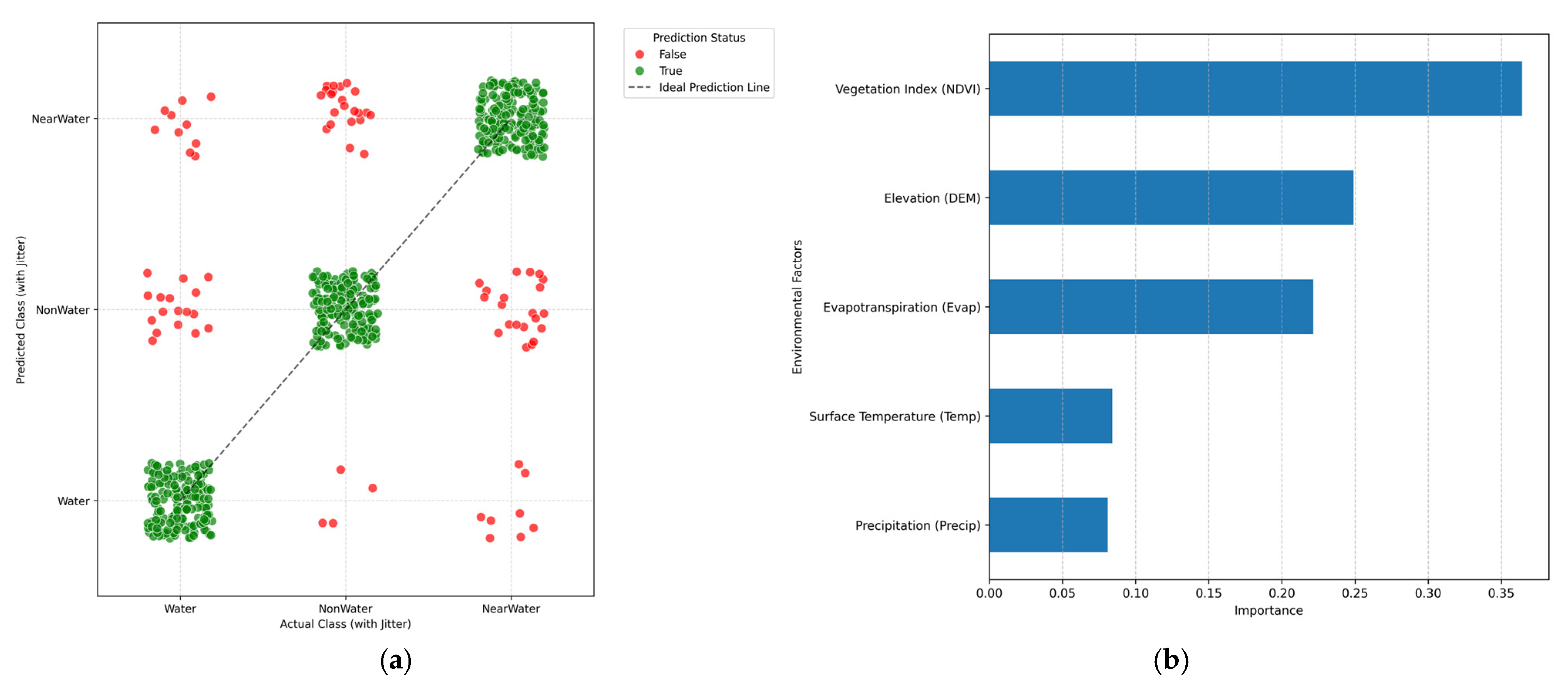 Feature importance analysis revealed that vegetation (0.364) and topography (0.249) were the primary predictors, followed by evapotranspiration (0.222), while surface temperature (0.084) and precipitation (0.081) had relatively weaker influences. These results suggest that vegetation cover and topographic changes have a stronger controlling effect on the spatial distribution of water bodies and near-water bodies than short-term hydroclimatic fluctuations. The results are shown in
