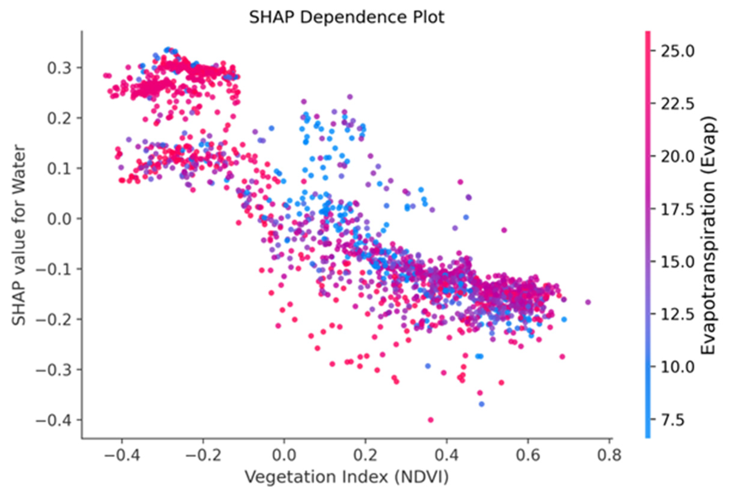 SHAP dependency plots for vegetation and topographic factors show that higher vegetation density combined with lower topography significantly reduces the probability of water body classification, reflecting the interaction between vegetation density and topographic depression.