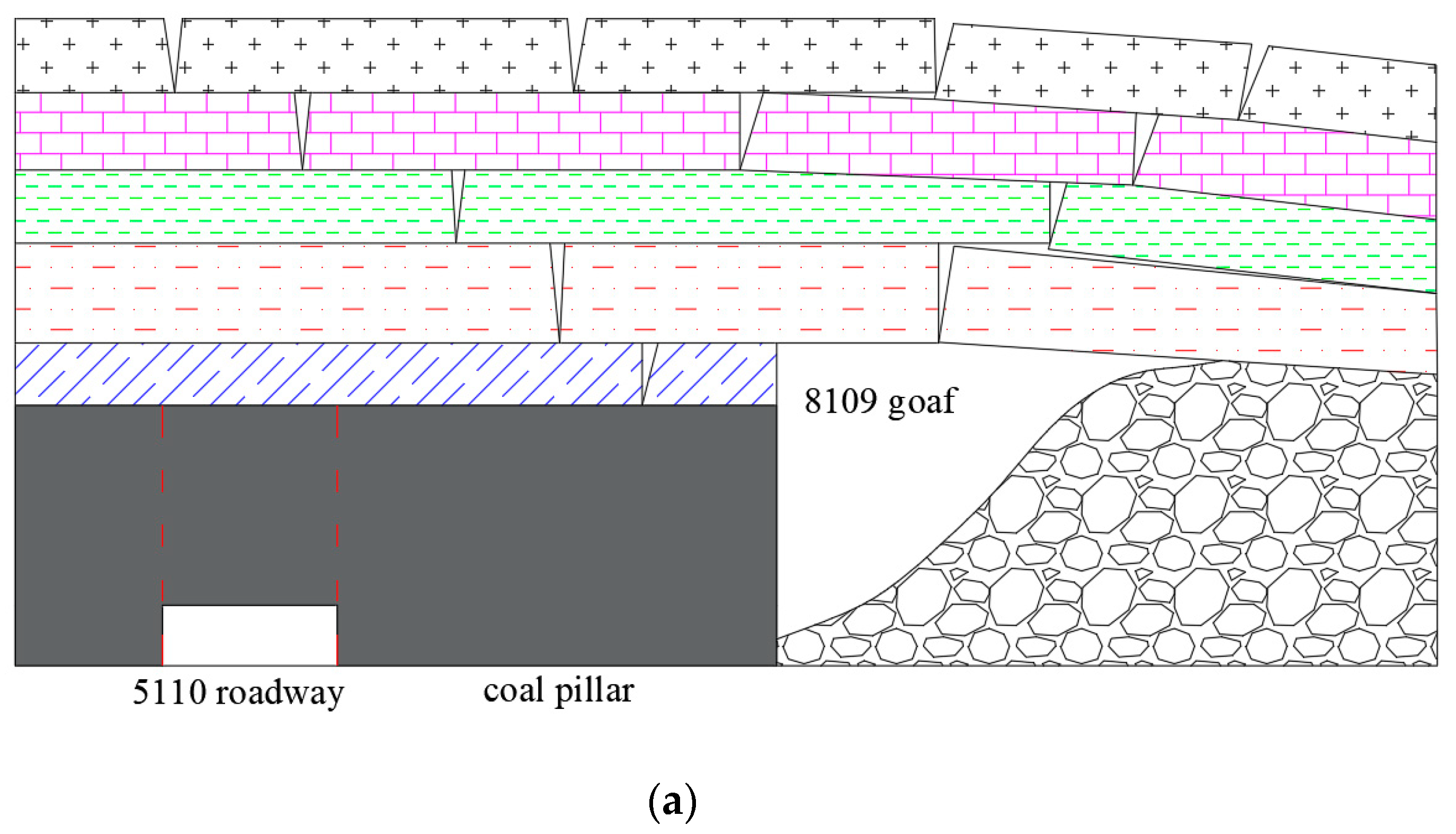 - Liu, W.; Guo, Z.; Hou, J.; Chen, D. Research and Application of Support Technology for Re-Mining Roadway in Goaf under Regenerated Roof in Thick Coal Seam. Geotech. Geol. Eng. 2019, 37, 4327–4335. [Google Scholar] [CrossRef]