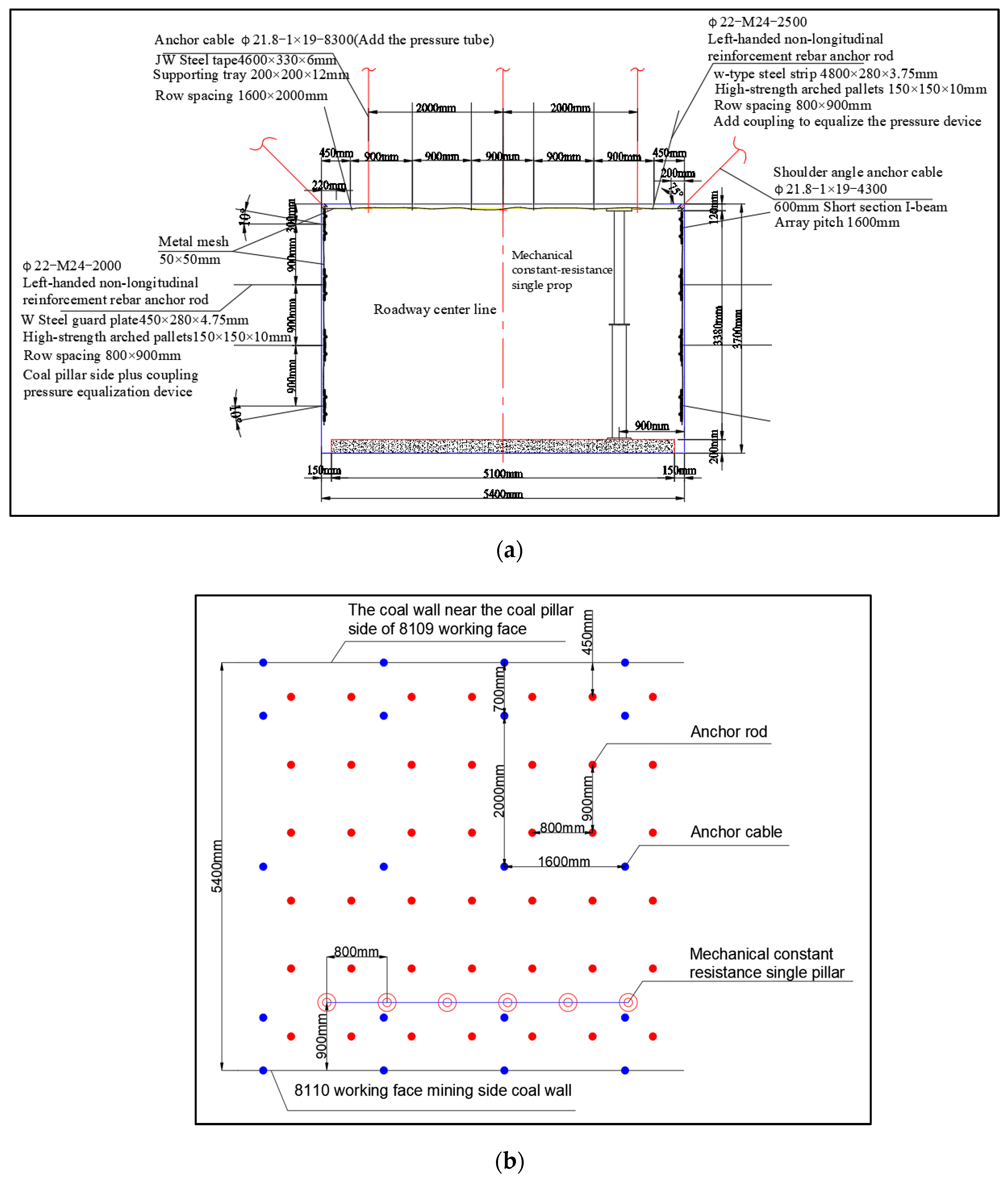 - Hao, Y.; Wu, Y.; Chen, Y.; Li, P.; Chen, L.; Zhang, K. An Innovative Equivalent Width Supporting Technology for Sustaining Large-Cross Section Roadway in Thick Coal Seam. Arab. J. Geosci. 2019, 1, 688. [Google Scholar] [CrossRef]