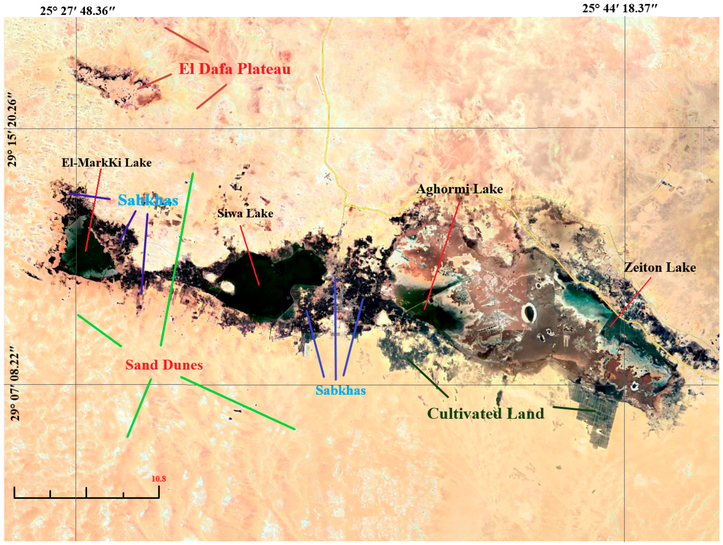 | Salt Lakes | (Al-Markki, Aghormi, Siwa, and Zeitun, Lakes), hypersaline waterbodies. Receive discharge from spring and subsurface flow. | |