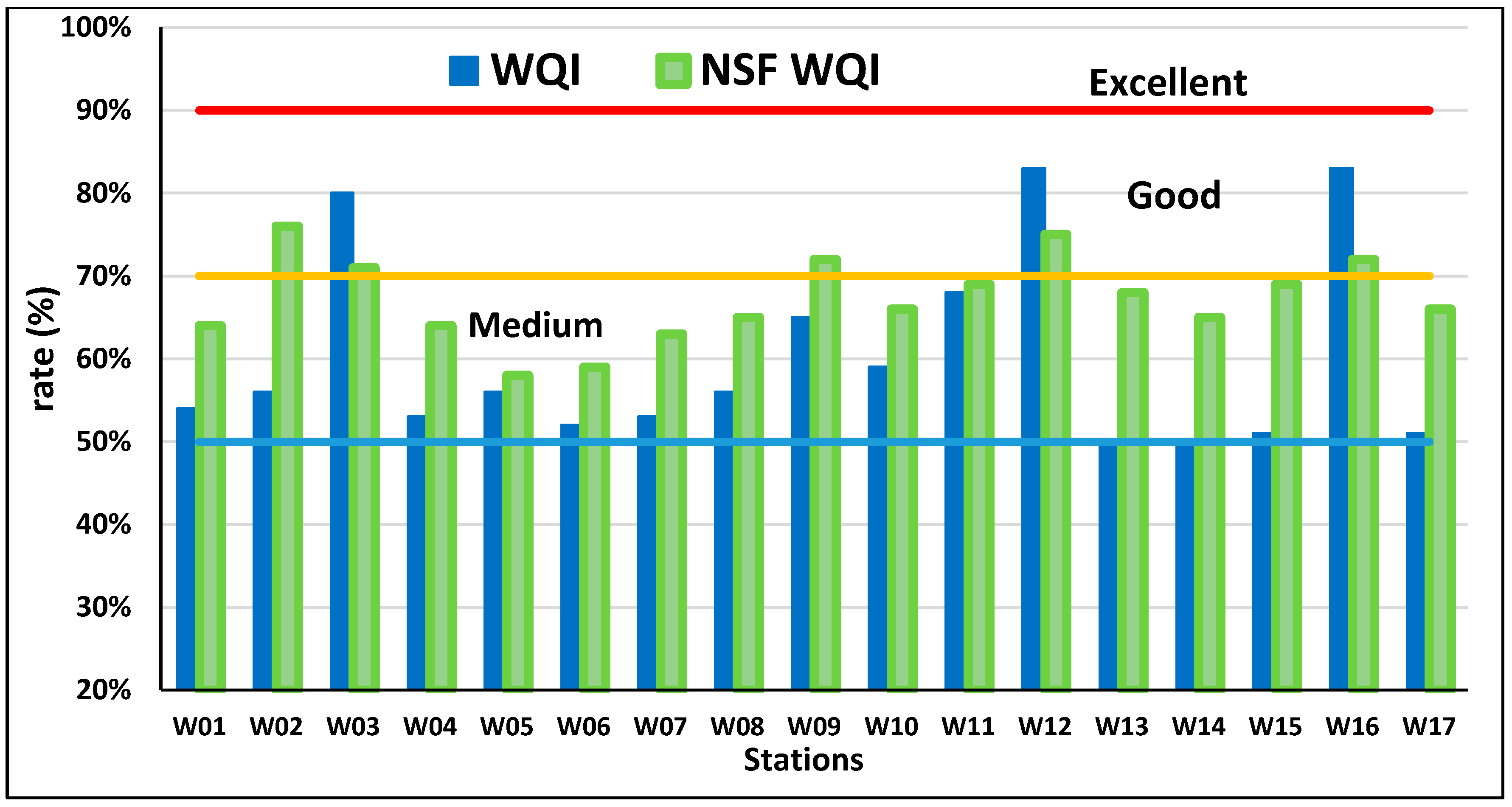 | CCME-WQI | Equation (1) F1 (scope): The percentage of parameters that exceed the allowable limit F2 (frequency): The percentage of individual tests for each parameter that exceeded the allowable limit F3 (amplitude): The degree to which each failed test exceeds the allowable limit | 91–100 71–90 51–70 26–50 0–25 | Excellent Good Medium Bad Very bad | [26] |