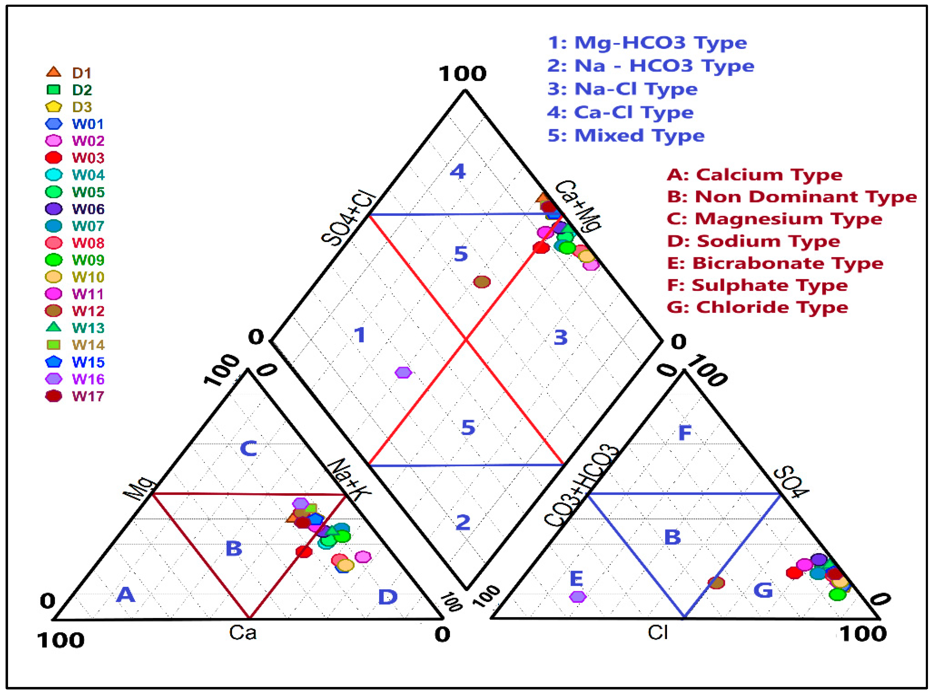 | Chloro-alkaline index (CAI-I) | Equation (5) | CAI > 0 CAI < 0 | Na+ or K+ is replaced by Ca2+ from water to sediment Ca2+ is replaced by Na+ or K+ from water to sediment | [29] |