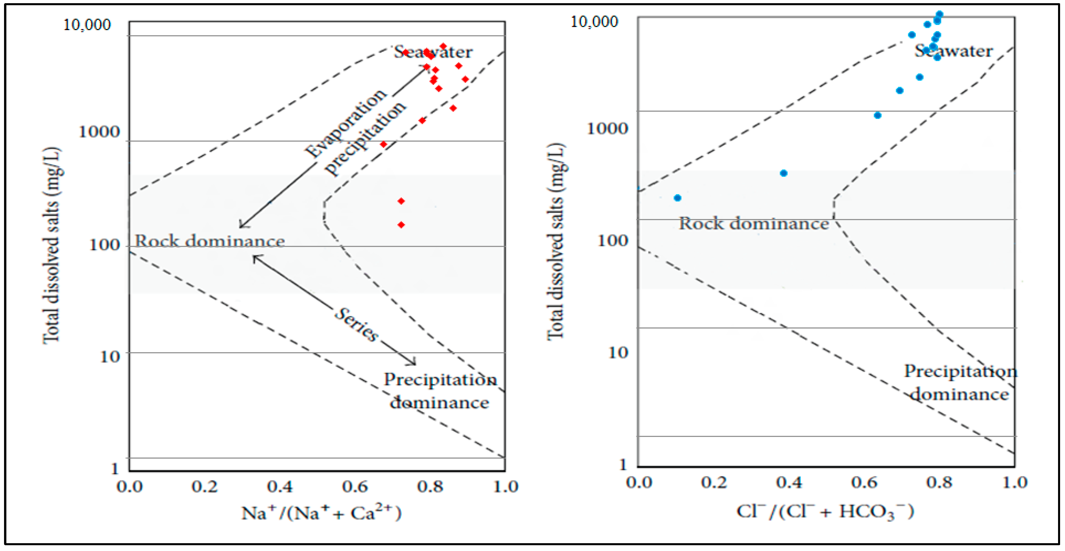 - Gibbs, R.J. Mechanisms controlling world water chemistry. Science 1970, 170, 1088–1090. [Google Scholar] [CrossRef]