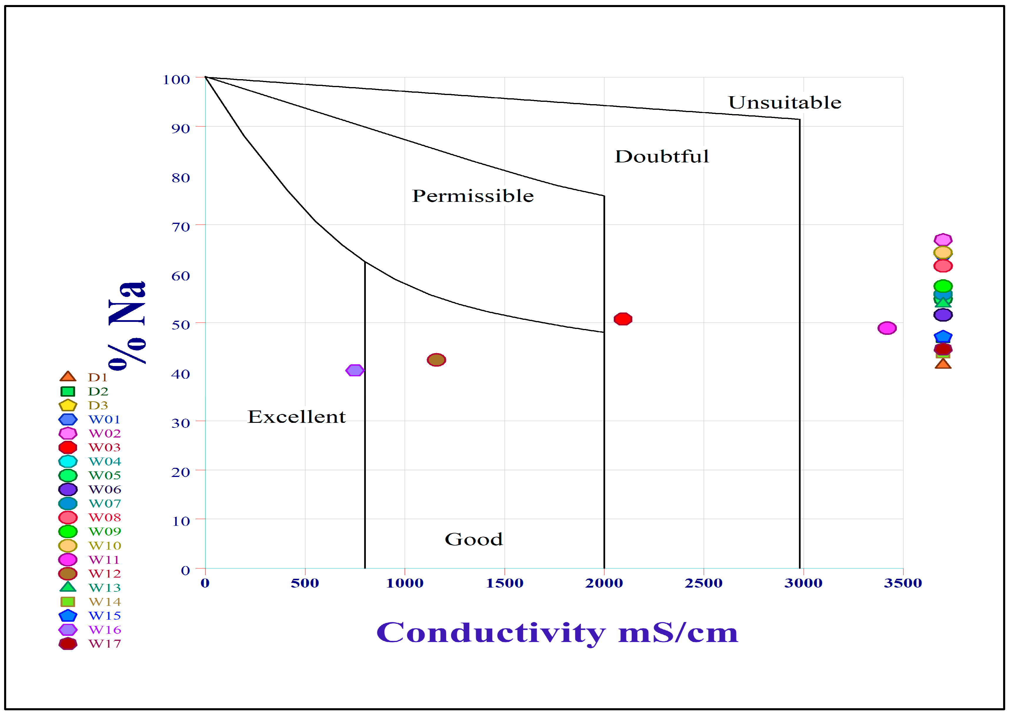 | Soluble sodium percentage (Na%) | Equation (8) | <20 20–40 40–60 60–80 >80 | Excellent Good Permissible Doubtful Unsuitable | [31] |