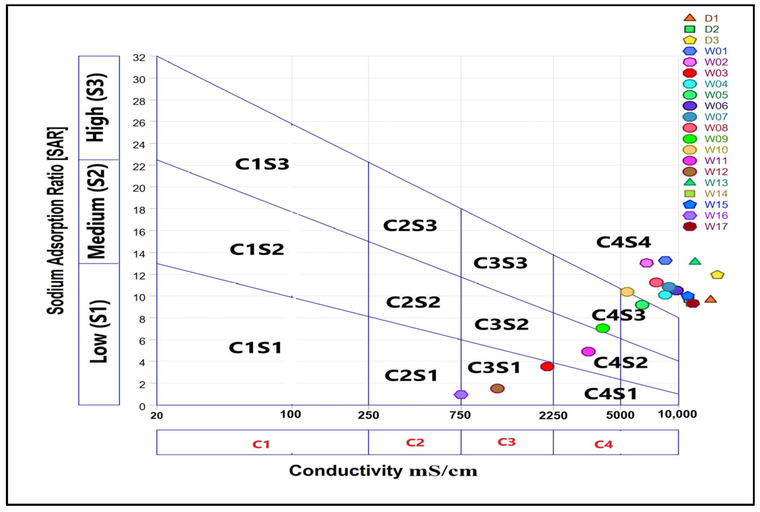| Sodium adsorption ratio (SAR) | Equation (7) | <10 10–18 18–26 L >26 | Excellent Good Doubtful Unsuitable | [30] |