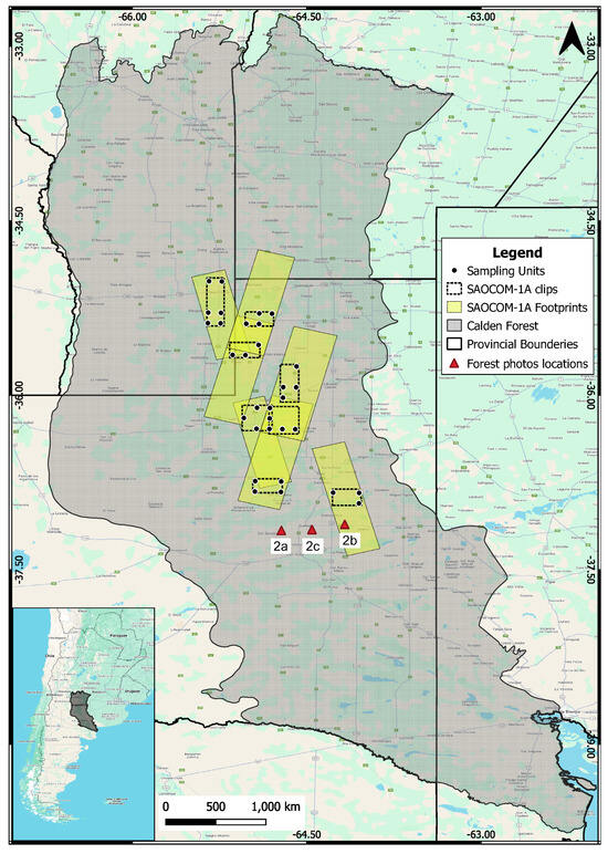 Figure 1. Location of the caldén (Neltuma caldenia) forest in central Argentina, the sampling units from the Second National Native Forest Inventory used in this study, the footprints of the selected SAOCOM-1A images, and the image subsets used for GRVI calculation. Red triangles show the locations of photos showing the different forest formations in Figure 2.