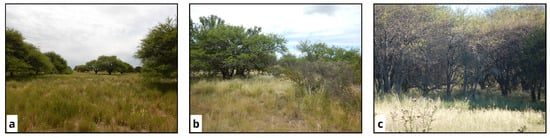 Figure 2. Open caldén (Neltuma caldenia) forest with grasses (a), open forest with shrubs (b), and closed forest (c). Photographs taken by the first author. These images are illustrative only, intended to provide a general view of the forest characteristics. They do not correspond to the sampling points but derive from a previous study, as photographs of the actual sampling points from the Second National Native Forest Inventory dataset were not available.