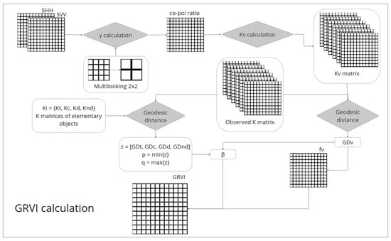 The GRVI can be more precisely described as the Generalised Volume Scattering Model-Based Radar Vegetation Index, as it measures the similarity between the observed Kennaugh matrix K and the generalised volume scattering model matrix K v for each pixel [40]. The index has an intuitive formulation, is easy to implement, and is computationally efficient [14]. It is defined as: