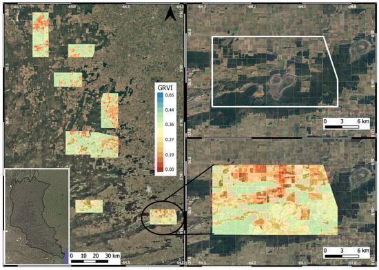 No effect of incidence angle or acquisition submode (ranging from 25° to 33°) was detected on GRVI values (Figure 5), despite the known angular sensitivity in some polarisations [48,58,59]. Model performance may have been affected by the use of a single SAOCOM-1A image per sampling unit, and limited scene availability hindered the implementation of multitemporal analyses [60]. However, previous research has demonstrated that single acquisitions can yield satisfactory results under certain conditions [17].