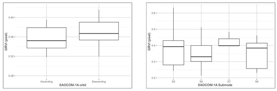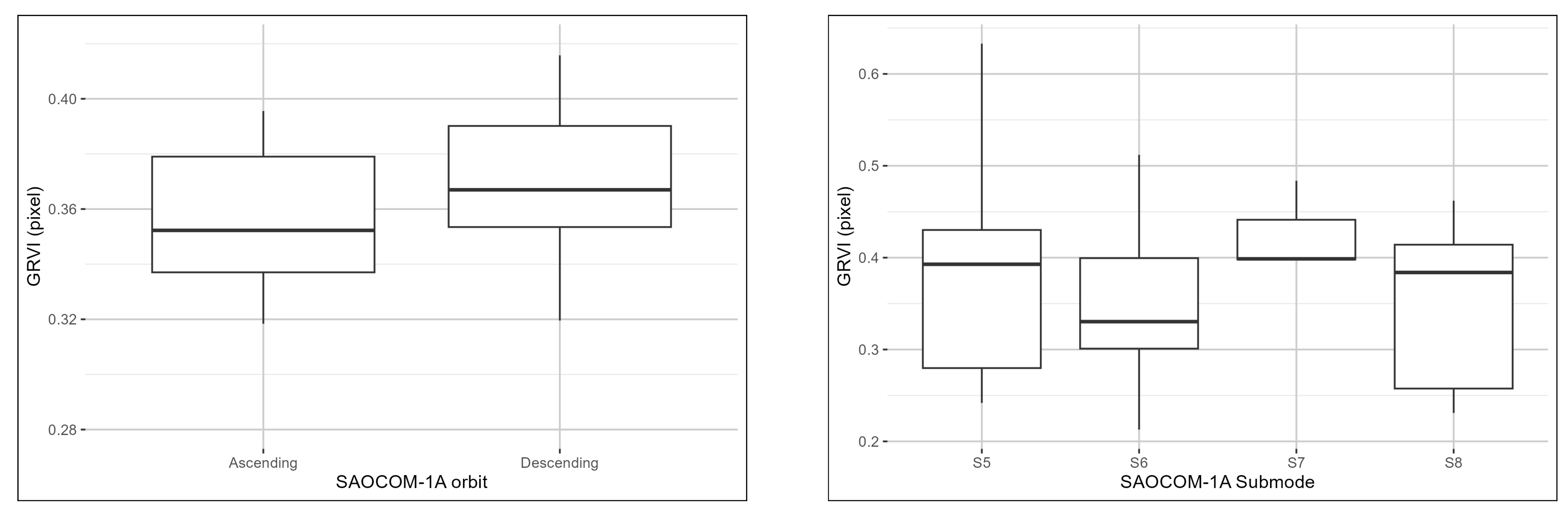 Figure 5. GRVI pixel values from SAOCOM-1A images acquired in winter 2019 for pixels containing sampling units from the caldén (Neltuma caldenia) forest in central Argentina, grouped by orbit type (left: ascending ( N = 12 ), descending ( N = 20 )) and acquisition submode (right: S5 ( N = 9 ), S6 ( N = 13 ), S7 ( N = 3 ), or S8 ( N = 7 )).