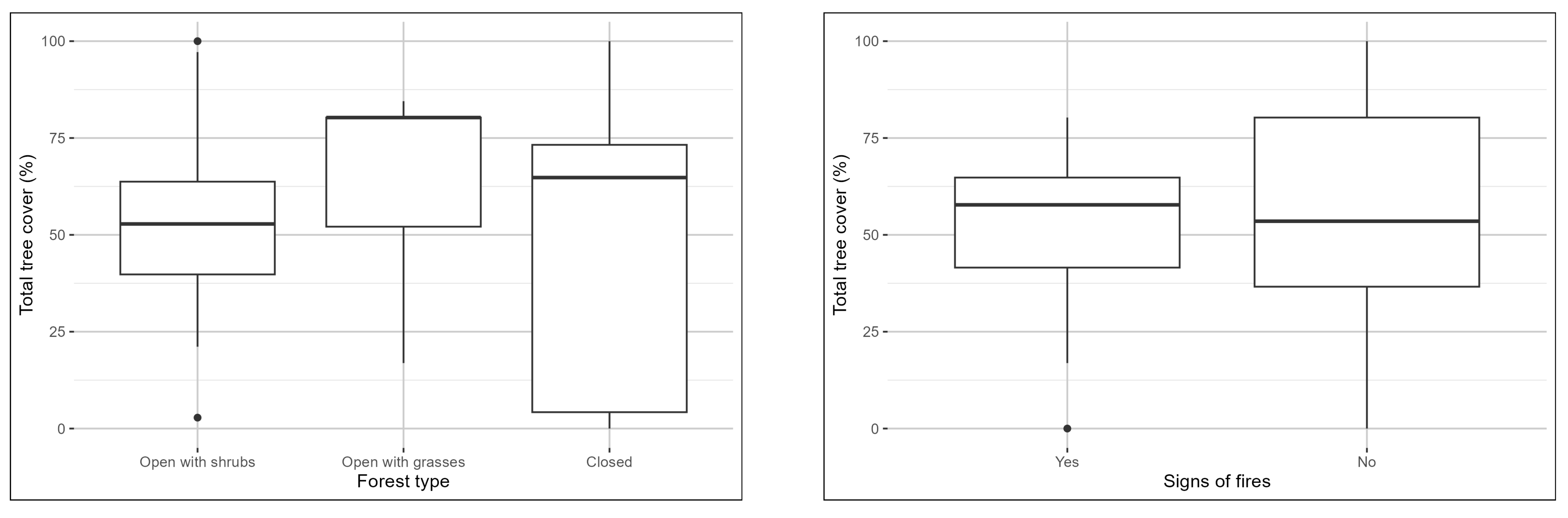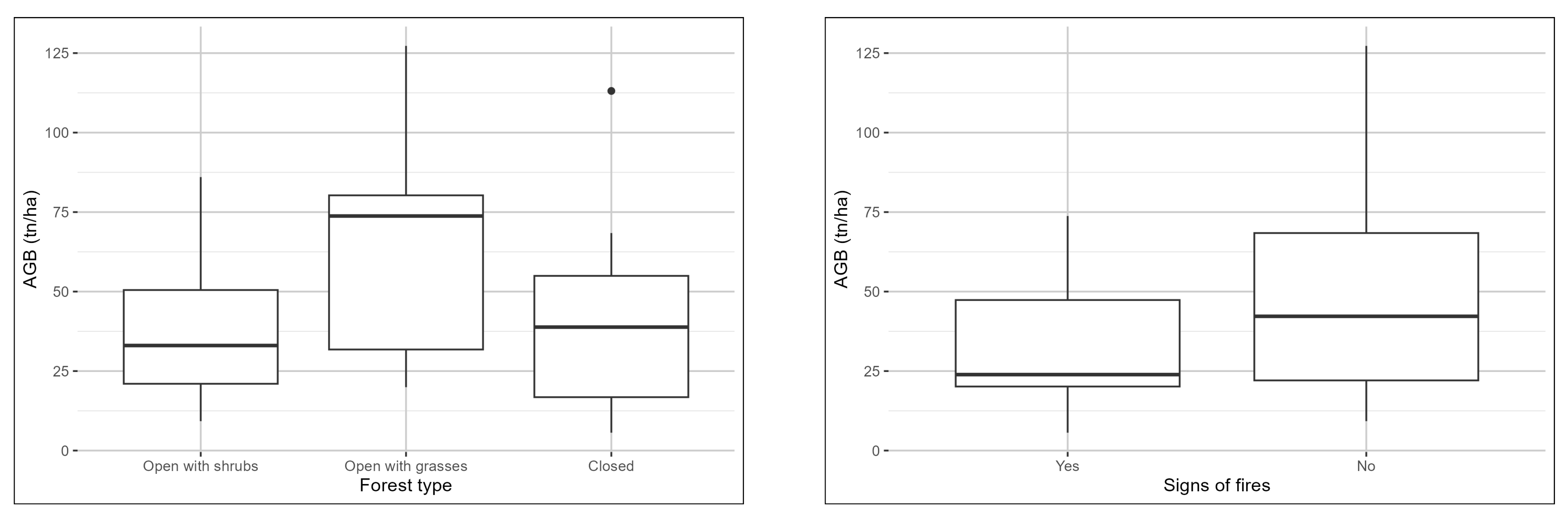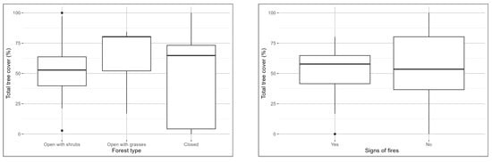Additionally, the database provided canopy cover data, defined as the projection of the vegetation crowns onto the ground, measured as a percentage using the line-intercept method [35]. For this analysis, the percentage of total tree cover—i.e., the crown projection of all woody individuals taller than 3 m —was included. Biomass and total tree cover values were analysed by forest type—closed (11 SUs), open with shrubs (16 SUs), and open with grasses (5 SUs)—and by fire occurrence, since fire can rapidly alter both forest attributes.