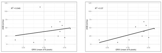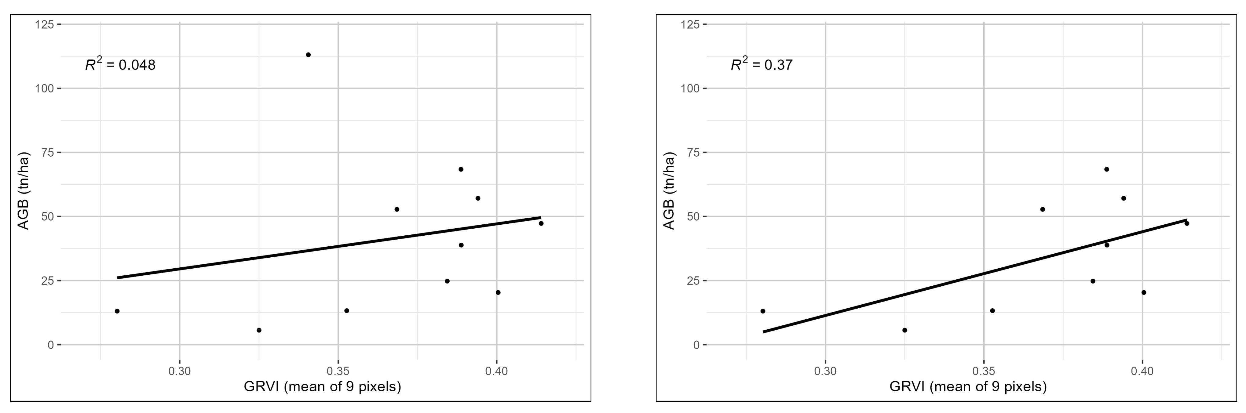 Figure 10. Simple linear regression between aboveground biomass (t ha−1) calculated from the Second National Native Forest Inventory [35] data for caldén (Neltuma caldenia) forest of central Argentina, and the GRVI values obtained from SAOCOM-1A images acquired in winter 2019 as a mean of 9 pixels for sampling units (SUs) classified as closed forest ( N = 11 , left). The same relationship is shown excluding the SU ( N = 10 ) that exhibited a divergent pattern, with high biomass (113.09 t ha−1) and a relatively low GRVI value ( 0.34 ) (right). The linear regression line and the R 2 value are included.