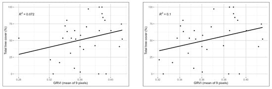 Figure 11. Simple linear regression between total tree canopy cover (%) obtained from the Second National Native Forest Inventory [35] for caldén (Neltuma caldenia) forest of central Argentina, and the GRVI values obtained from SAOCOM-1A images acquired in winter 2019 as a mean of 9 pixels for sampling units (SUs), including all 32 SUs ( N = 32 , left) and excluding 1 SU ( N = 31 , right). The linear regression line and the R 2 value are included.
