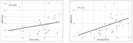 Figure 12. Aboveground biomass (t ha−1) calculated from the Second National Native Forest Inventory [35] data for caldén (Neltuma caldenia) forest of central Argentina, as a function of the volume (green) component from the Pauli decomposition ( N = 32 , left) and the helix component from the Yamaguchi decomposition ( N = 32 , right), both obtained from SAOCOM-1A images acquired in winter 2019. The linear regression line and the R 2 value are included.