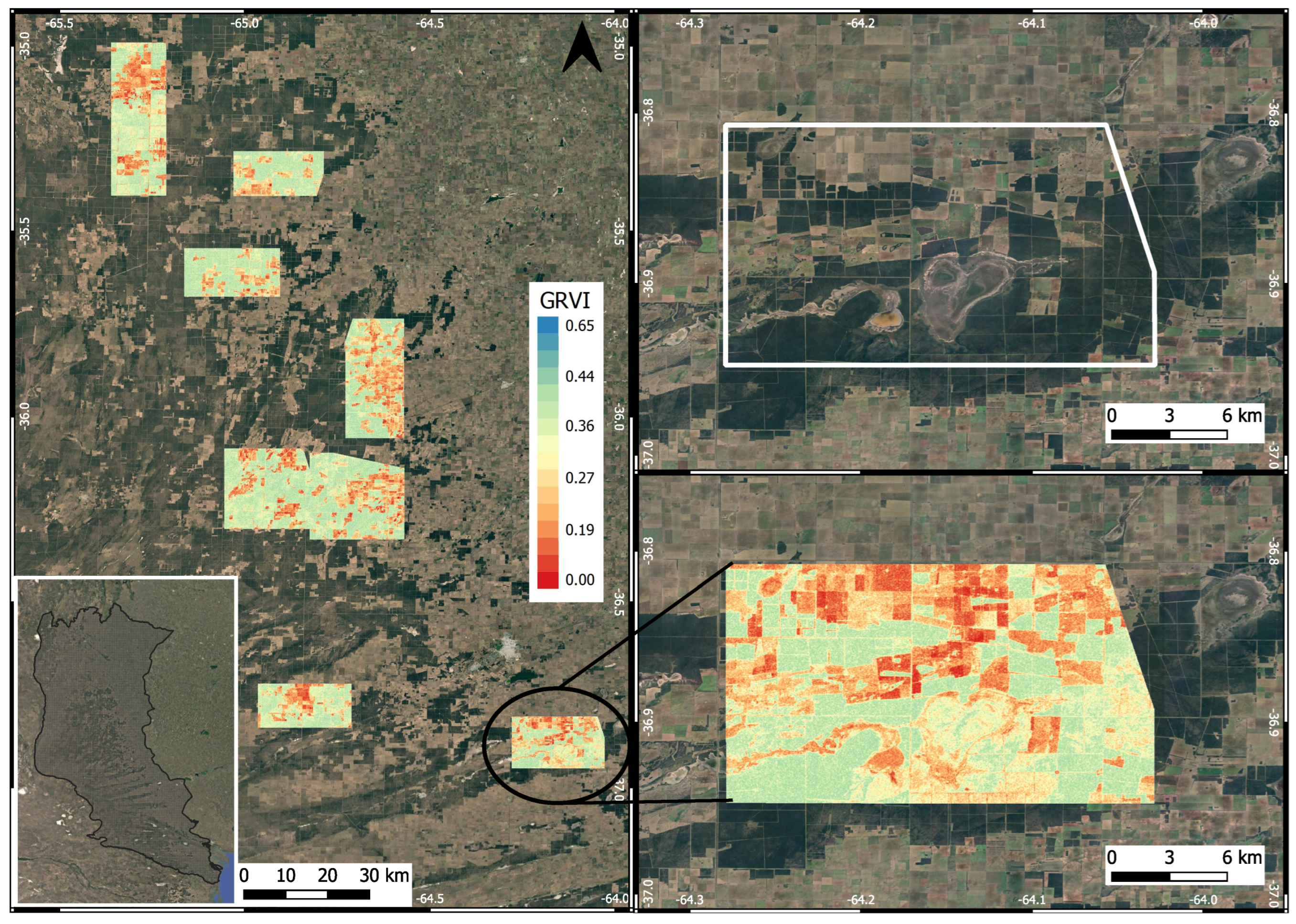 Figure 4. GRVI maps obtained with a 5 × 5 focal filter applied to eight SAOCOM-1A image subsets from winter 2019 for the caldén (Neltuma caldenia) forest (left) in central Argentina. A zoomed-in view of one subset is shown at the bottom right and the same area is displayed using a Google Satellite image for comparison (top right). Forest areas appear in green.