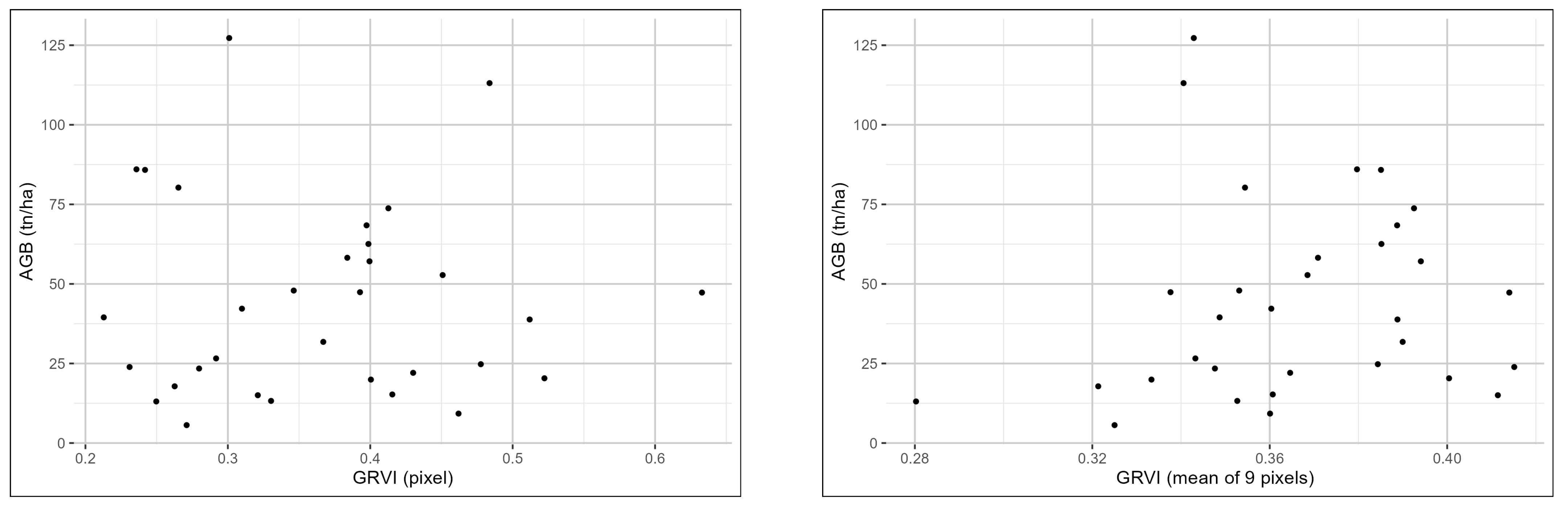Figure 8. Aboveground biomass (t ha−1), derived from the Second National Native Forest Inventory [35] for the caldén (Neltuma caldenia) forest of central Argentina ( N = 32 ), as a function of the SAOCOM-1A-derived GRVI value of the pixel corresponding to each sampling unit, without applying any speckle filtering (left). A comparable relationship is presented using the mean GRVI value computed from the 9 neighboring pixels after applying a focal speckle filter (right).
