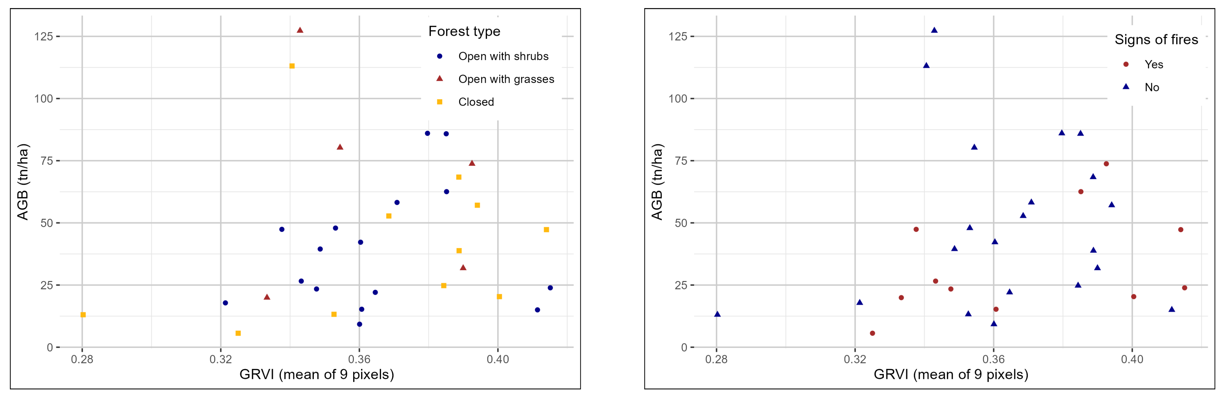 Figure 9. Aboveground biomass (t ha−1), derived from the Second National Native Forest Inventory [35] for the caldén (Neltuma caldenia) forest of central Argentina ( N = 32 ), is shown as a function of the mean GRVI value computed from 9 pixels in SAOCOM-1A images acquired in winter 2019. Sampling units are grouped by forest physiognomy (closed, open with grasses, and open with shrubs, left) and by fire occurrence (YES or NO, right).