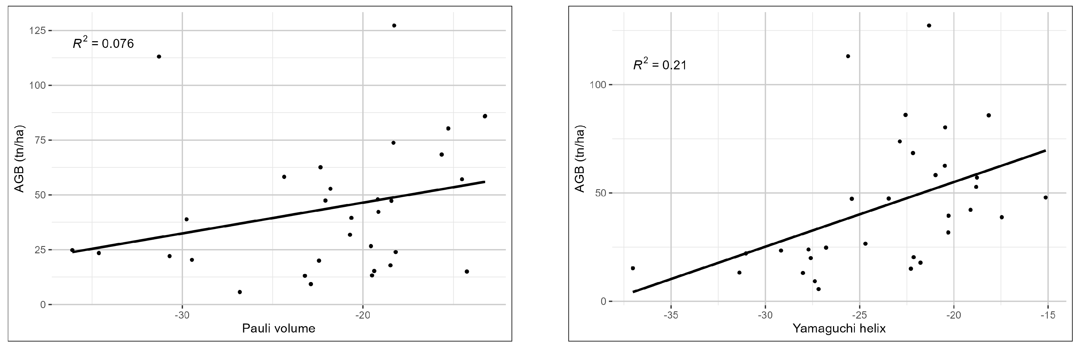 Biomass modelling in the semiarid caldén forest, using data from the Second National Native Forest Inventory [35], yielded inconclusive results but provided valuable insights. GRVI values showed limited variability (0.21 to 0.63) despite a broad range of observed biomass (5.62 t ha−1 to 127.27 t ha−1). Most regression models showed weak or non-significant relationships. Some positive trends were found in closed forest units, and a weak yet significant relationship was observed between GRVI and canopy cover ( R 2 = 0.1 ), contrasting with stronger results observed in other ecosystems [9]. Among radar-derived features, only the volume component from the Pauli decomposition and the helix component from the Yamaguchi decomposition were significantly associated with biomass, although the latter is typically linked to artificial structures [56,57].