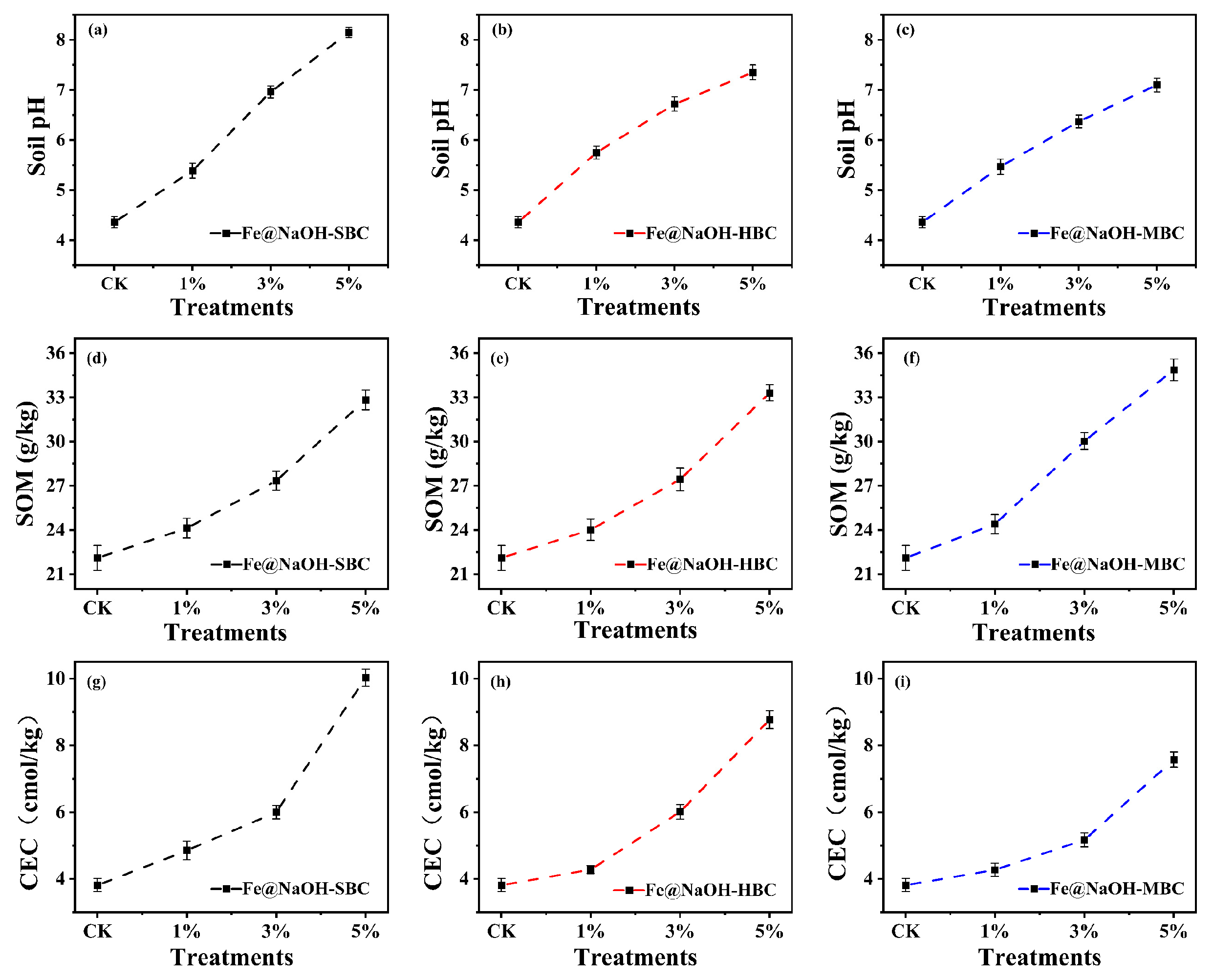 3.3.1. Effects of Alkali–Fe-Modified Biochar Application on Soil pH, SOM, and CEC