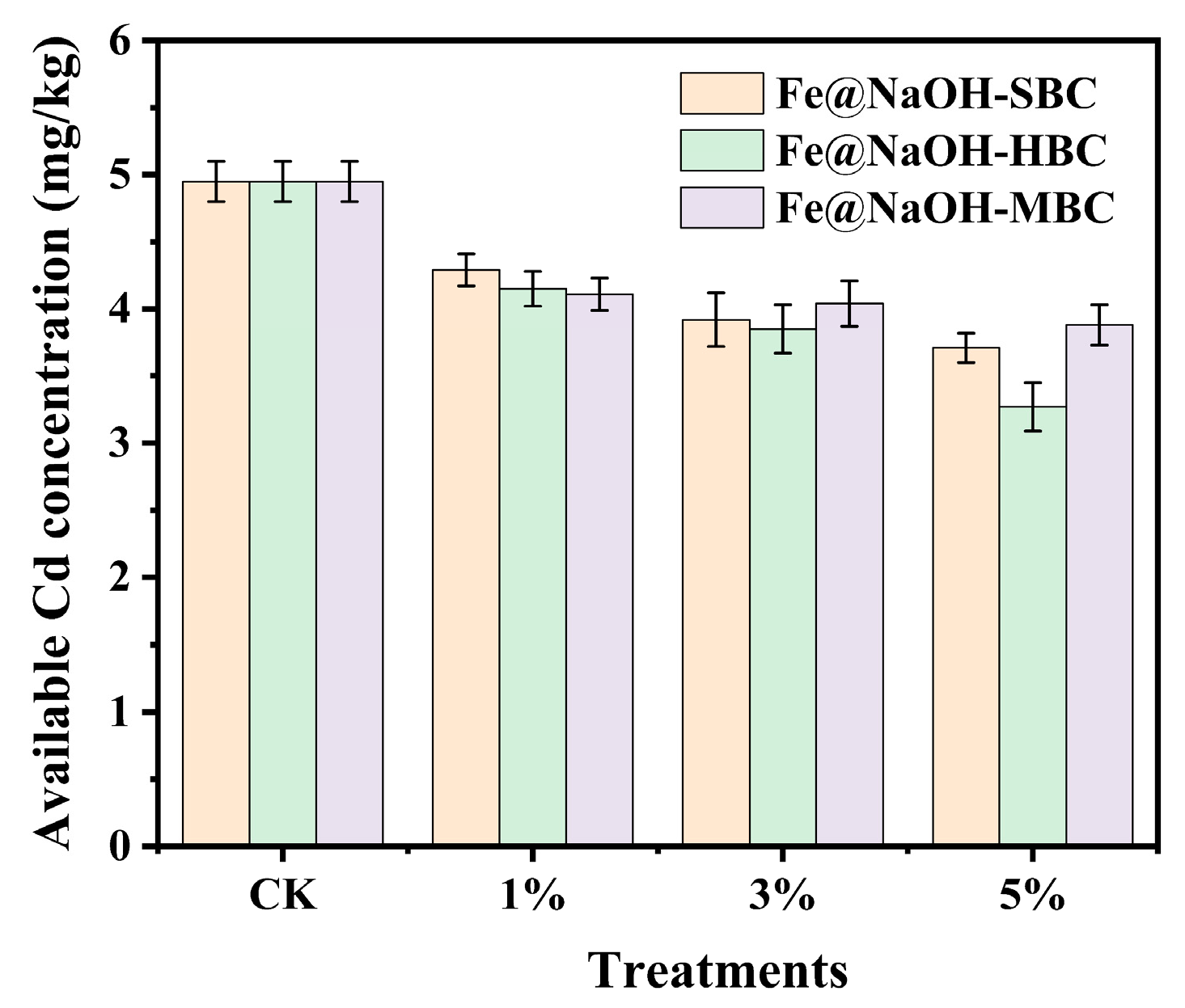3.3.2. Effect of Applying Alkali–Fe-Modified Biochar on the Bioavailability of Heavy Metals in Soil