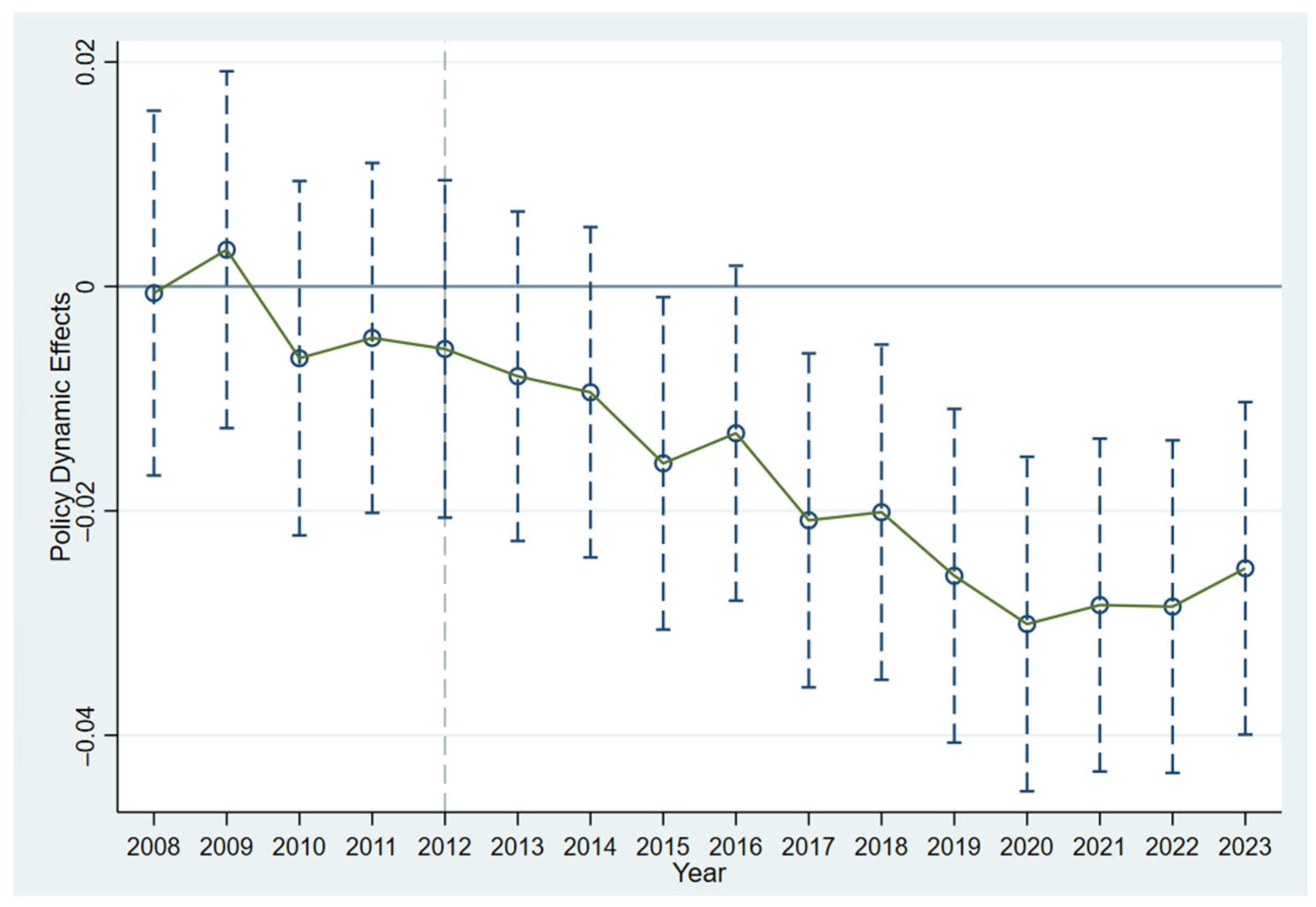 As shown in Figure 1, the regression coefficient estimates for the years 2008 to 2011 were all non-significant. Following the promulgation of the Guidelines in 2012, the coefficients exhibited annual fluctuations with a degree of volatility, yet became statistically significant from 2017 onwards. This pattern reflects two factors: firstly, inherent implementation lags within the policy framework, alongside ongoing refinement requirements for the policy itself. The gradual introduction of supporting measures has facilitated phased adjustments to the policy’s regulatory intensity and coverage scope. Concurrently, enterprises and financial institutions must synchronously adapt to evolving policy demands, a process that contributes to fluctuations in the policy’s impact on capital structure. Concurrently, the abnormal stock market fluctuations in 2015 precipitated rapid deleveraging, heightening uncertainties in corporate equity financing. The 2017 supply-side structural reforms accelerated capacity reductions in heavily polluting industries, directly curtailing corporate investment and financing demands. Between 2020 and 2023, the pandemic strained corporate operating cash flows, triggering a phase of financing tightening. Such events interacted with green credit policies, further amplifying the volatility in policy effects. Moreover, research indicates that the role of green credit policies in promoting industrial low-carbon transformation varies significantly across regions [19]. Due to differing regional response times to policies, regression coefficients remained non-significant five years after policy implementation. These findings confirm that the study data satisfy the parallel trends assumption, permitting the use of the difference-in-differences approach.